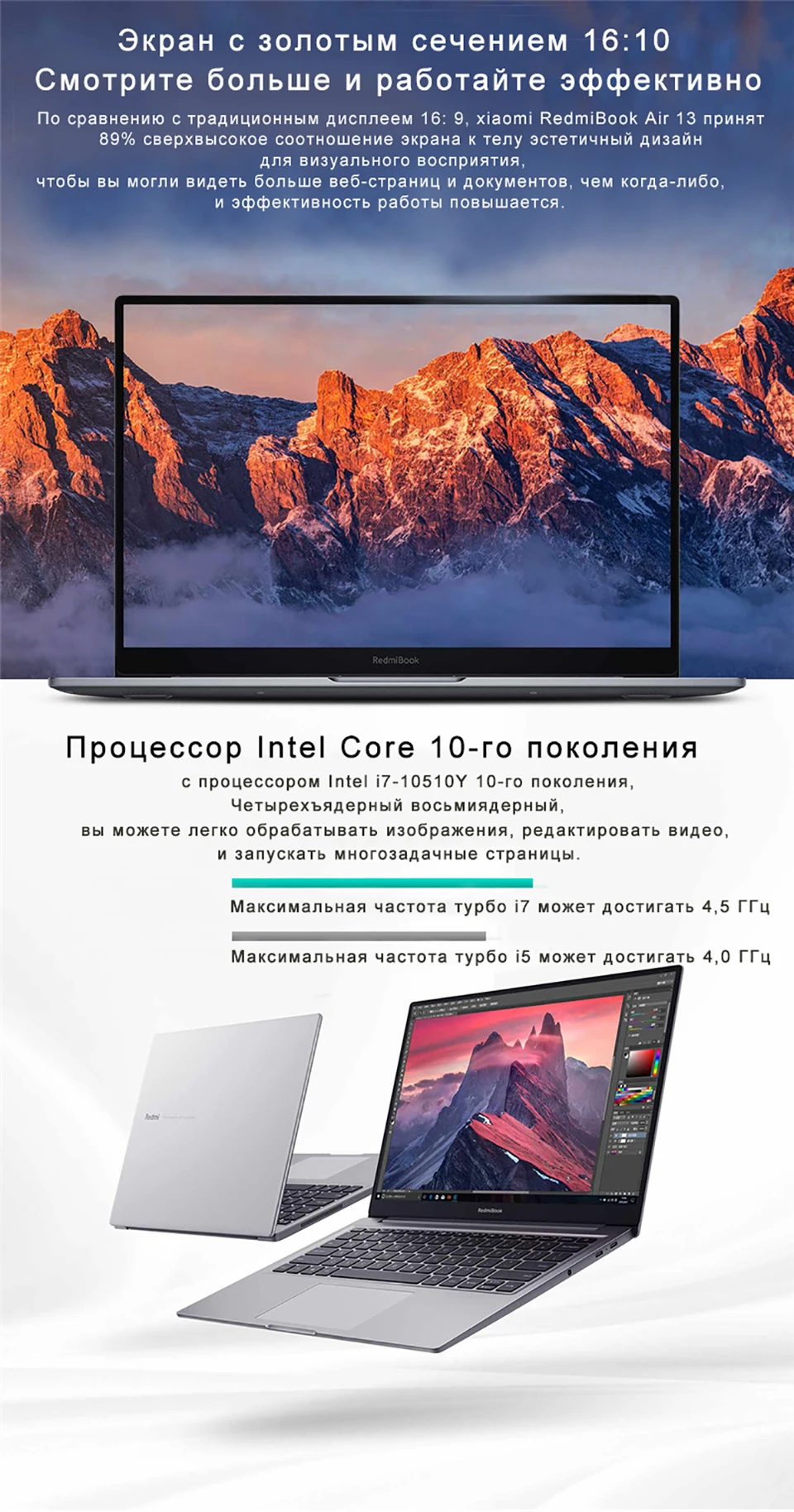Ноутбук оснащен 13,3-дюймовым антибликовым дисплеем с разрешением Full HD и соотношением площади экрана к корпусу 89 процентов. Он имеет графику Nvidia GeForce MX250 и 8 ГБ оперативной памяти DDR4. Он работает на процессоре Intel Core 10-го поколения. RedmiBook 13 имеет металлический корпус и поддерживает объемный звук DTS.