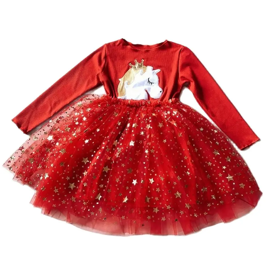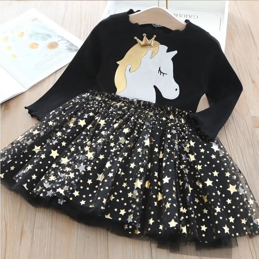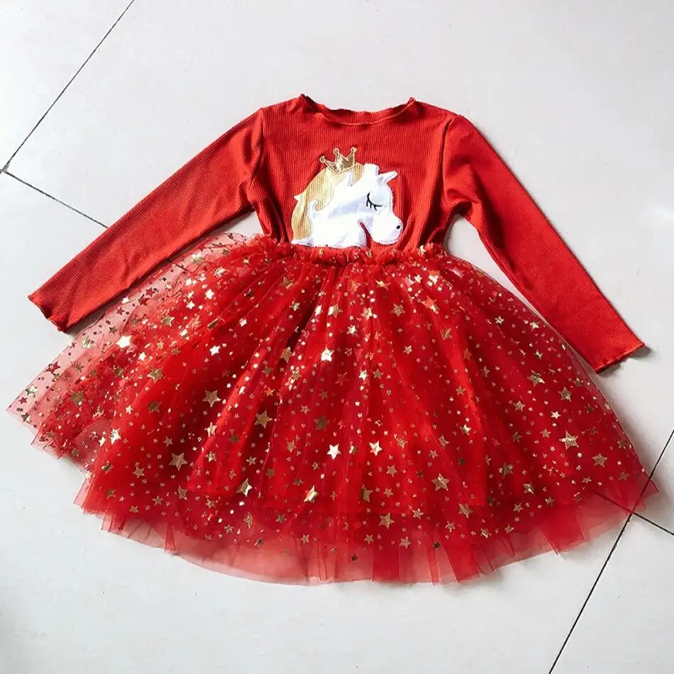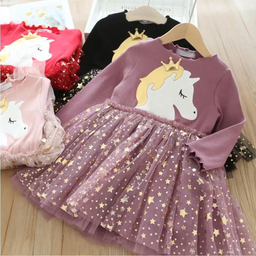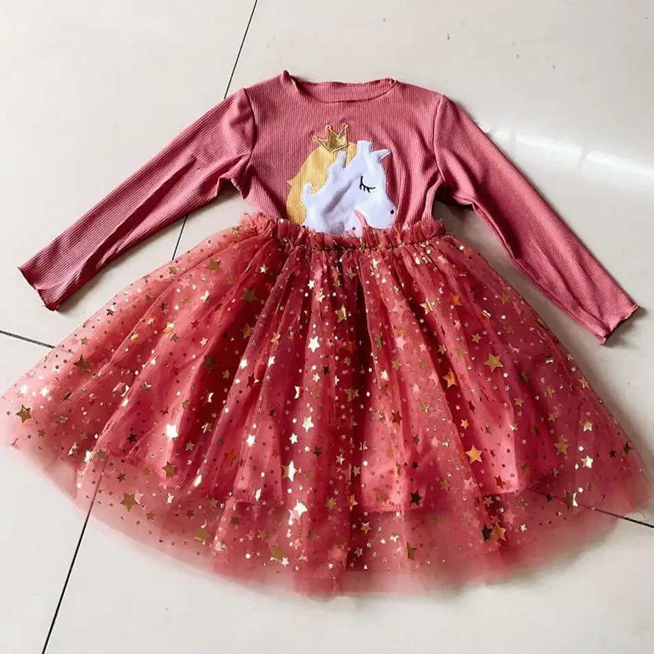 Осень Единорог Платье с длинными рукавами для девочек, вязаный свитер в виде короны, пони, звезды для Сетчатое платье для принцессы в стиле пэчворк для детей для маленьких девочек платье для девочек на день рождения