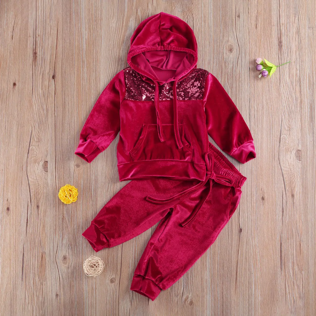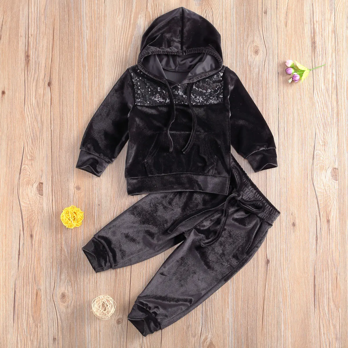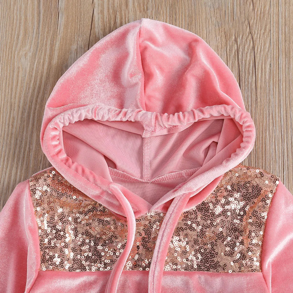 Бархатный костюм для младенцев свитер с капюшоном и блестками + брюки весенне-осенняя одежда в рубчик с вышивкой и блестками