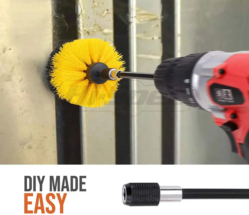 Набор из 4 частей щеток и скрабов просто помещается в патрон головки любого подходящего инструмента для дрели (не поставляется в комплекте) для эффективной очистки и чистки электродвигателя. Чистка больше не является утомительной и грубой задачей с уставшими спинками, болезненными руками и истощением. Уменьшает не только количество усилий, но и сокращает время очистки для прямых пятен и грязи в напольном покрытии, плинтусах, а также кухонных поверхностях