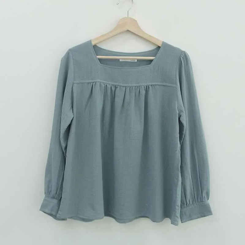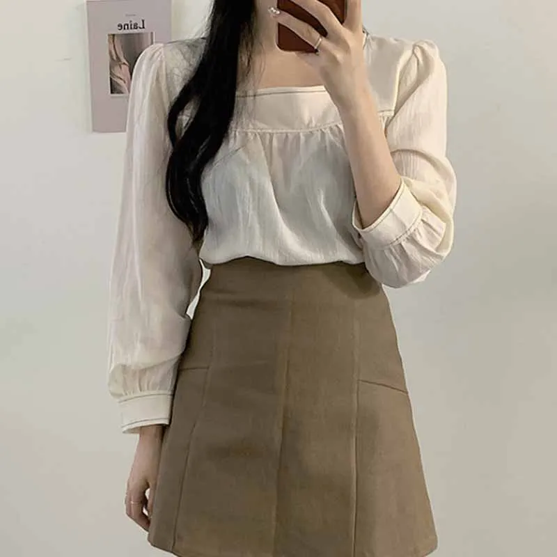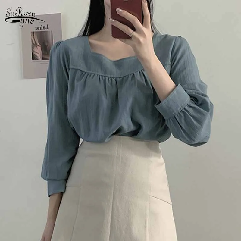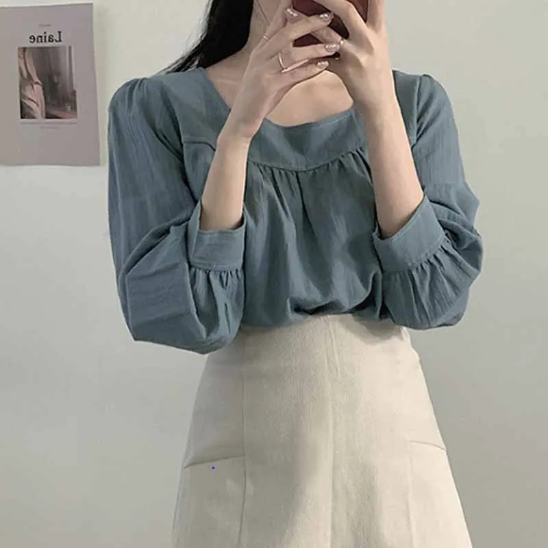 Женская одежда, милая однотонная блузка в Корейском стиле с квадратным воротником, женские рубашки с длинными рукавами-фонариками и сращением, блузы 11667
