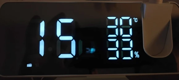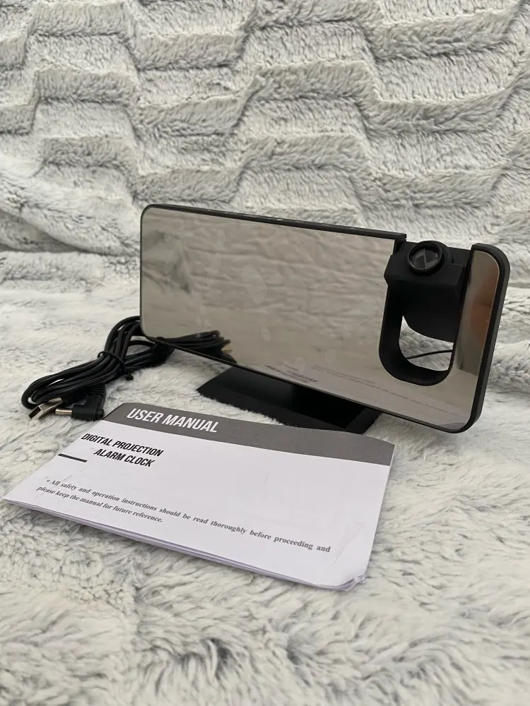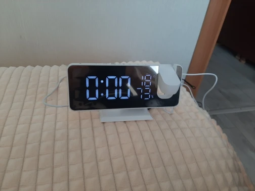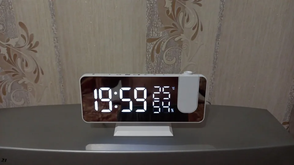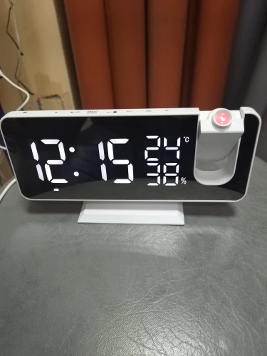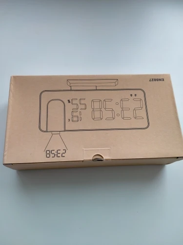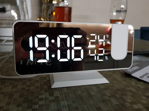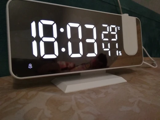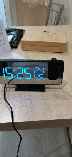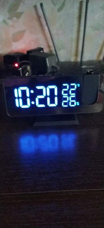 Часы отличные. Днём сам часы видно отлично. Автозатемнение делает свет от часов не таким ярким ночью. Проекция примерно 40х20см на расстоянии 2метра. Ночью её видно хорошо. В проекции показывает только время. Температуру и влажность только на самих часах. В настройке простые. В комплекте шла инструкция на английском языке и кабель питания. Так же установлена батарейка что бы время не сбивалось.