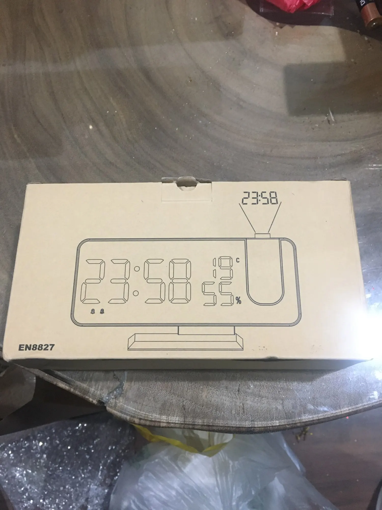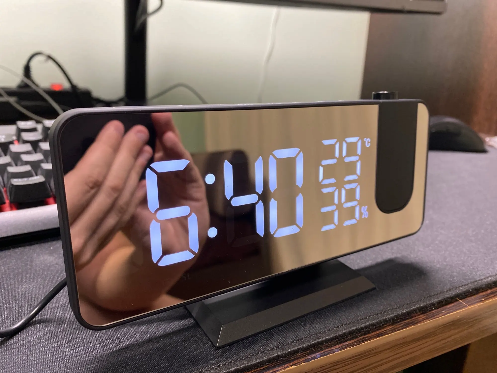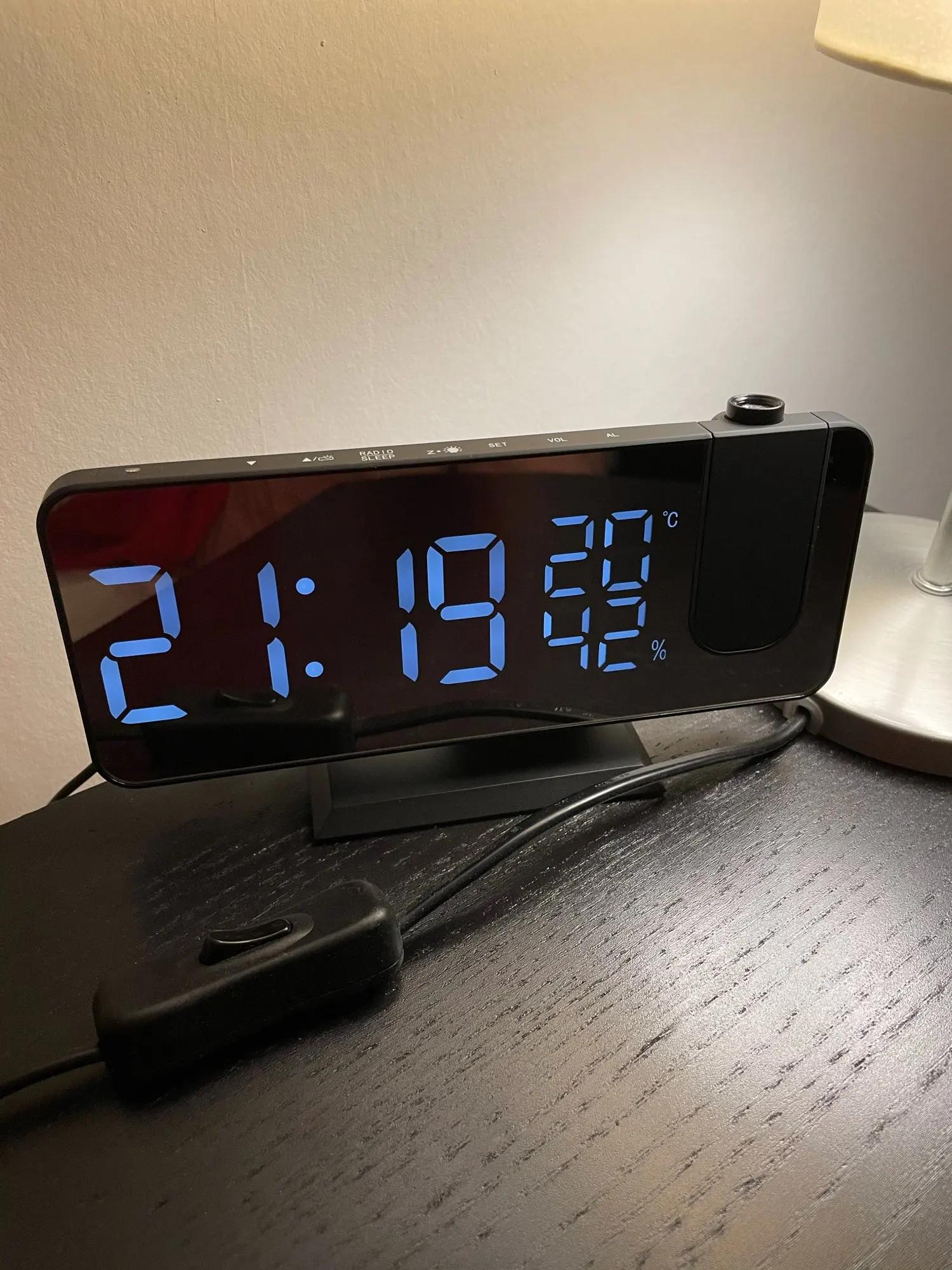 Часы отличные. Днём сам часы видно отлично. Автозатемнение делает свет от часов не таким ярким ночью. Проекция примерно 40х20см на расстоянии 2метра. Ночью её видно хорошо. В проекции показывает только время. Температуру и влажность только на самих часах. В настройке простые. В комплекте шла инструкция на английском языке и кабель питания. Так же установлена батарейка что бы время не сбивалось.