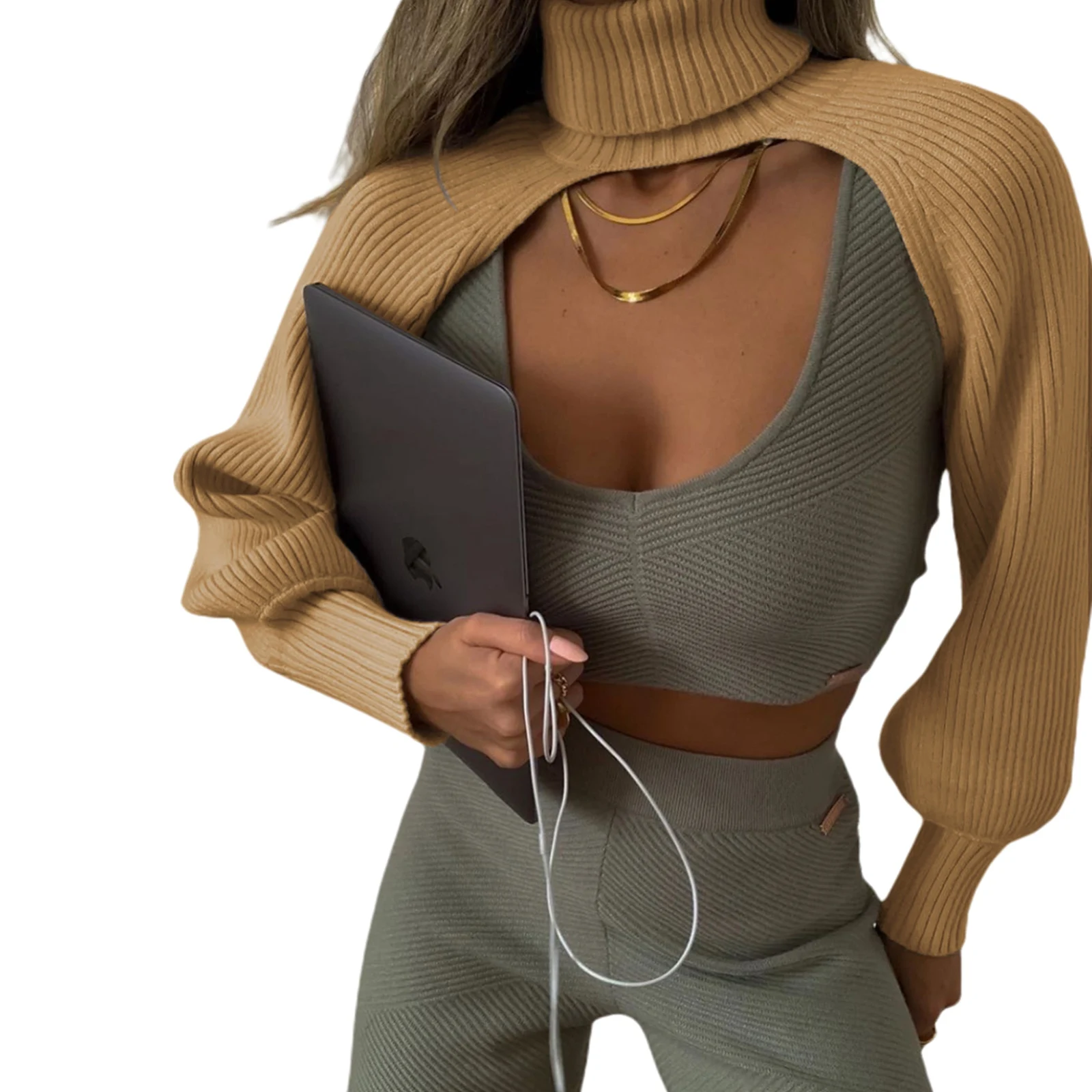 Женский свитер, топы, женская мода, элегантный однотонный трикотажный пуловер с высоким воротником и длинными рукавами-фонариками для женщин, кофта женская