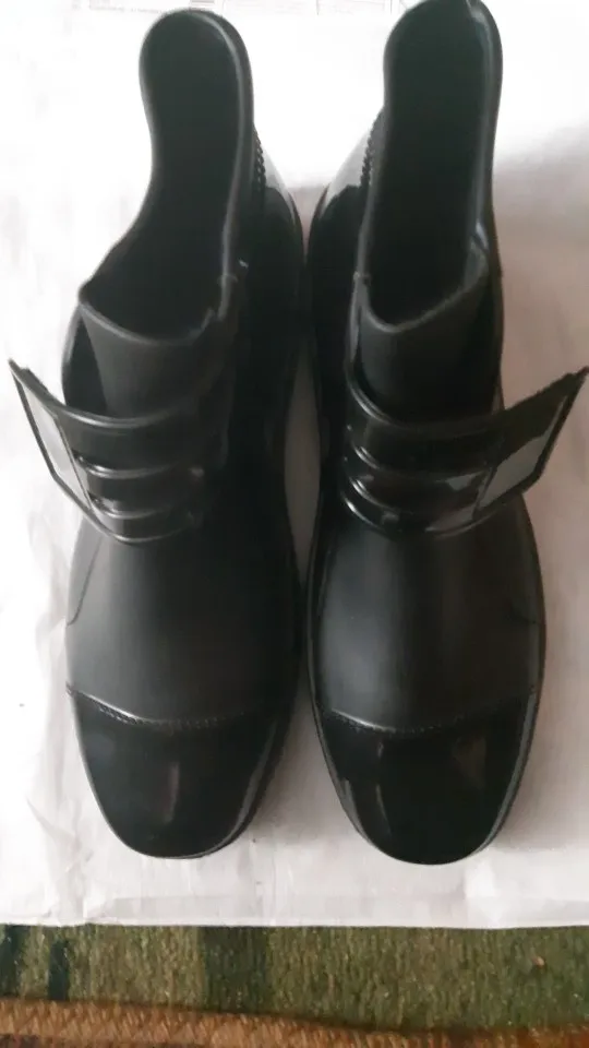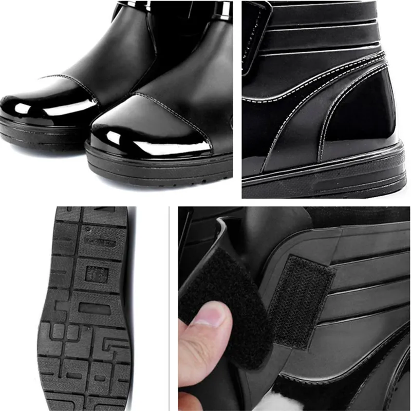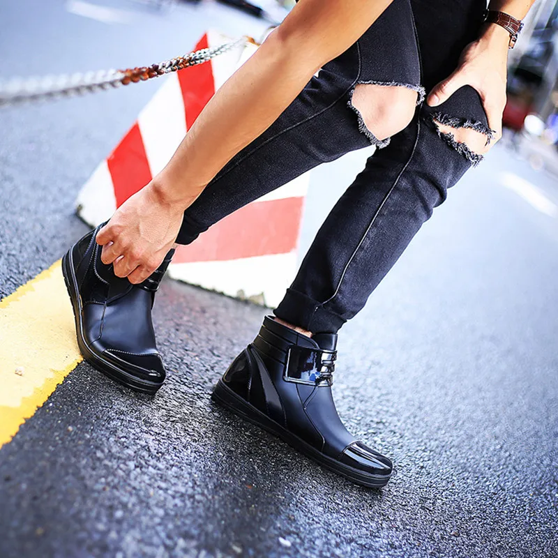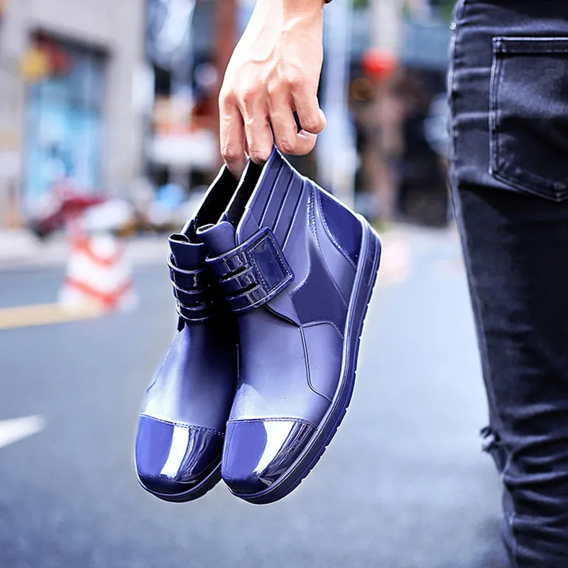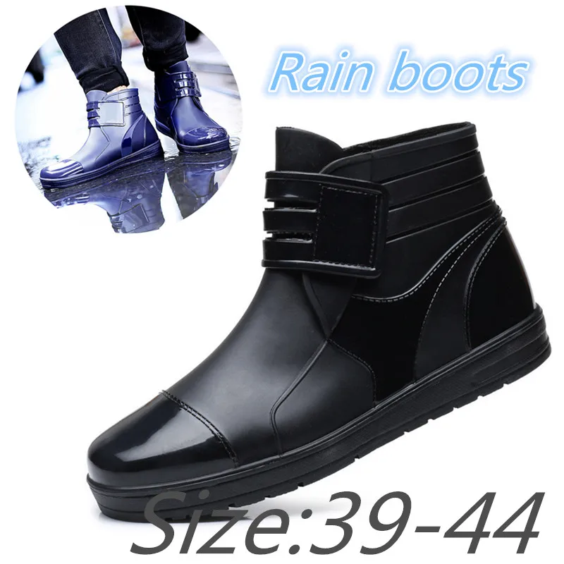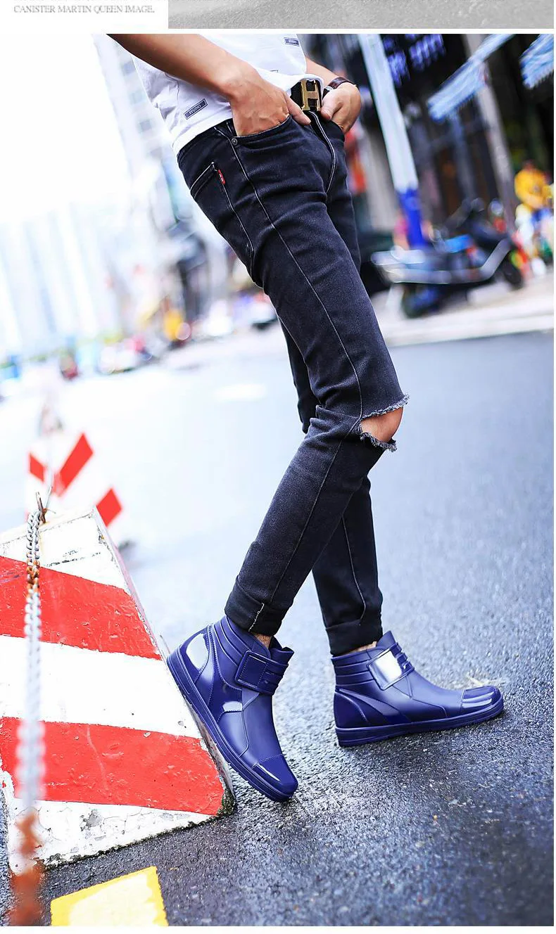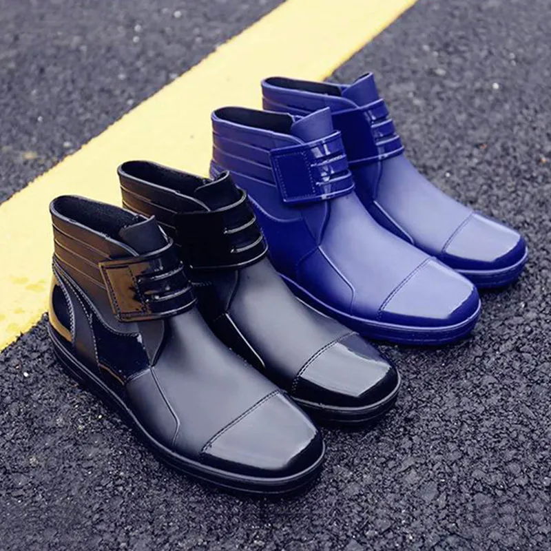 Модные корейские непромокаемые ботинки с коротким голенищем мужские водонепроницаемые ботинки из ПВХ Лидер продаж, Нескользящие ботинки на плоской подошве с липучкой