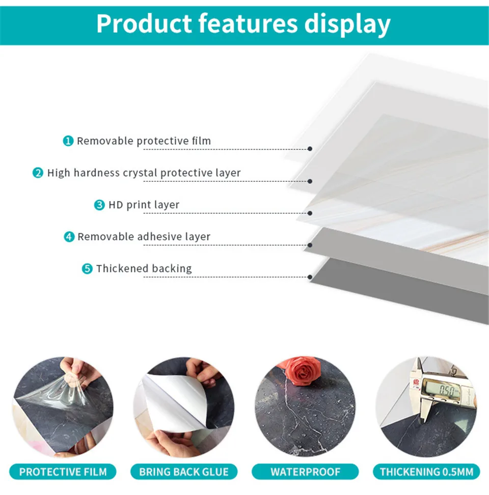 Характеристика: покрыт защитной пленкой, глянцевый, самоклеящийся и водонепроницаемый, легко моется, не требуется никаких инструментов, просто отклейте и приклейте.