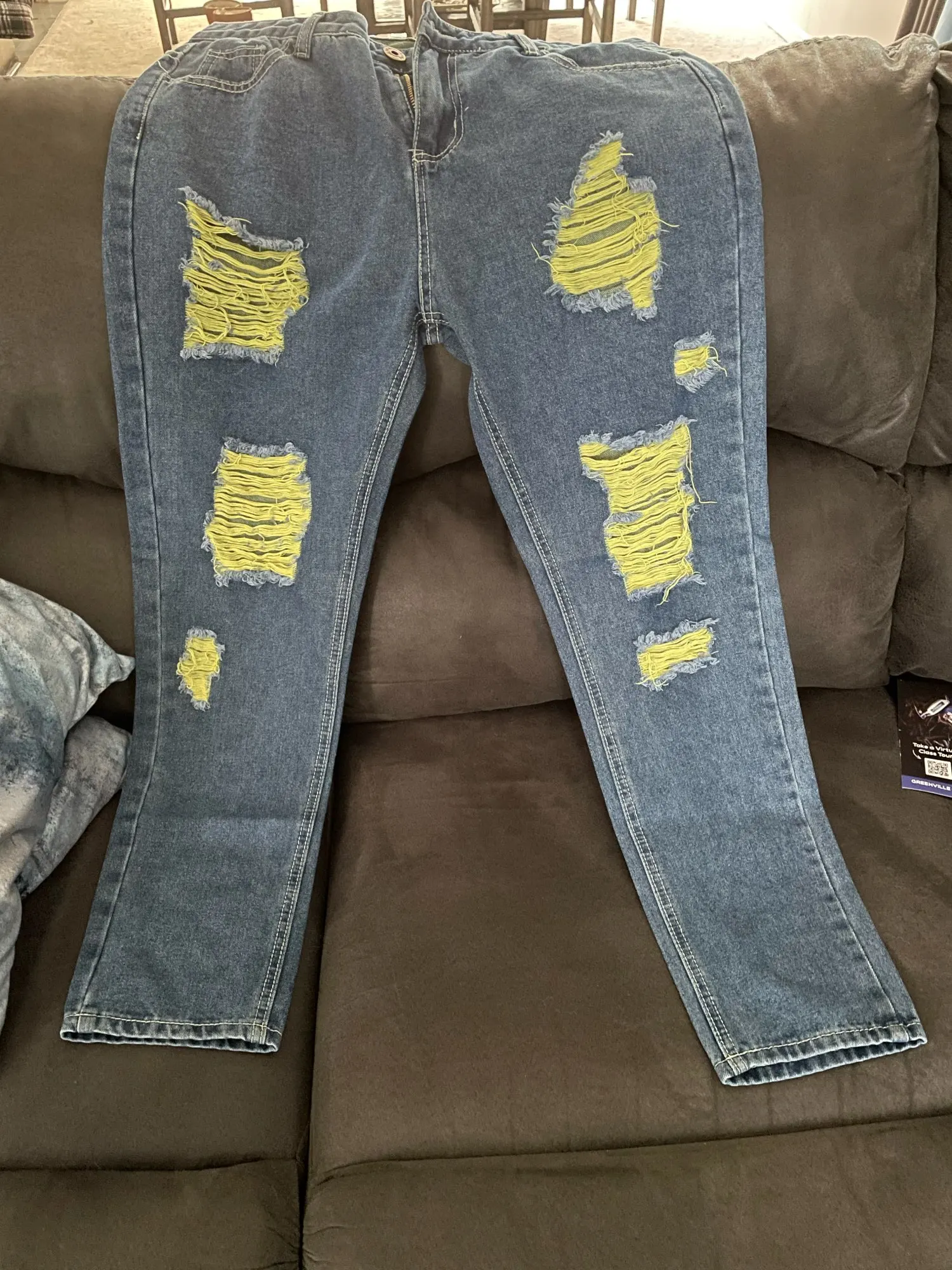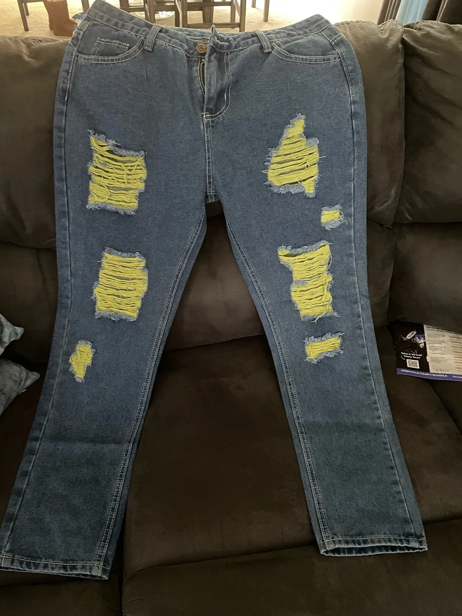 Так что большое разочарование цвета совсем не похожи на модель, которую я хотел, чтобы линии были желтыми, я получил их зелеными, и я даже не говорю о разрезании джинсов, которые очень разочаровывают