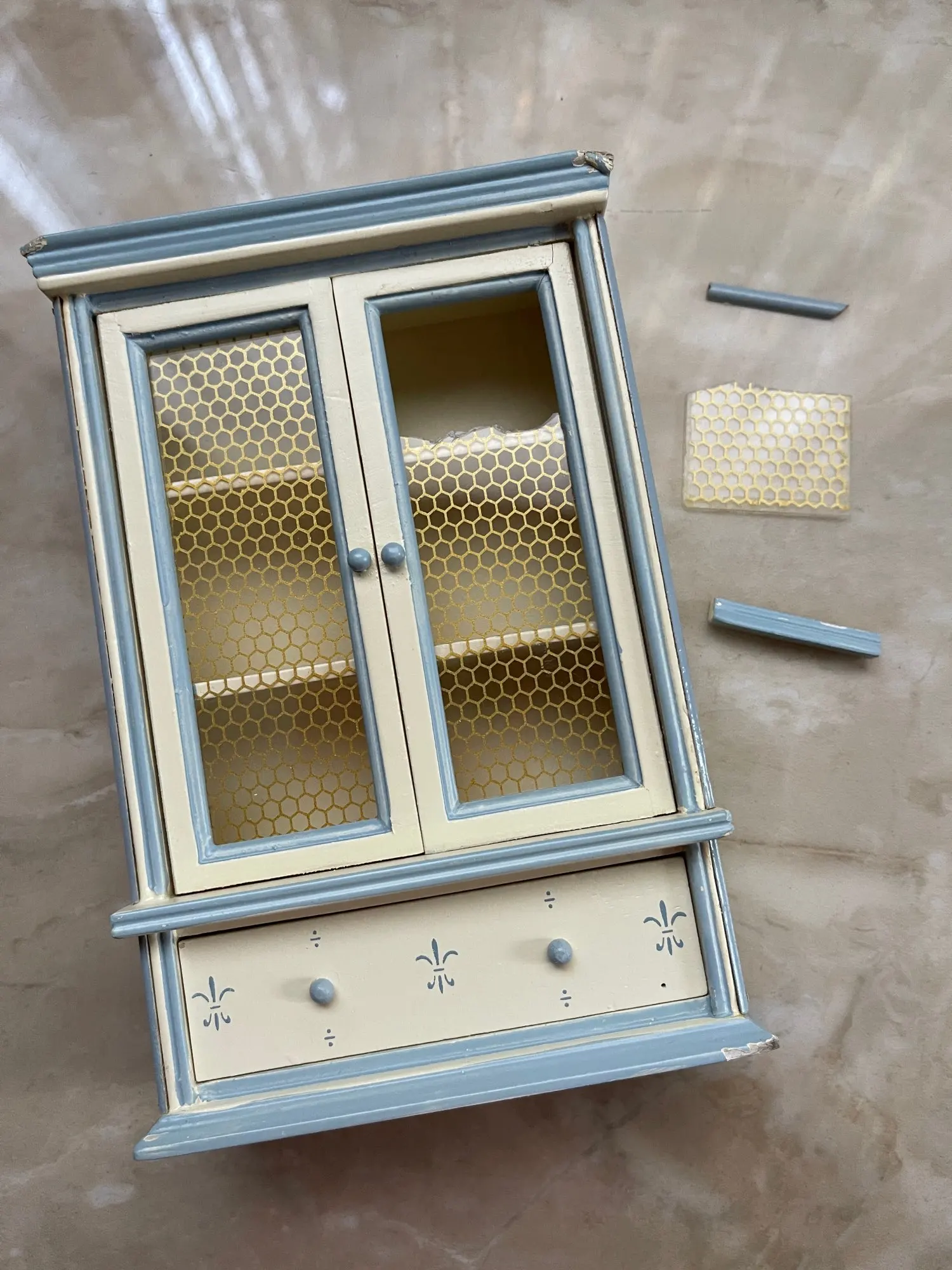 Так же, как изображено/описано. Ящики и двери открываются. Одна из ножек была отправлена, но ее легко приклеить.