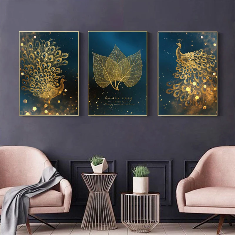 Модульная Картина на холсте, 3 панели, с изображением золотых листьев, HD-печать, для гостиной, домашний декор, картины с изображением павлина