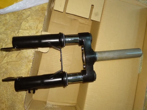 пришло в помятой коробке, но с виду ничего не сломалось, вмятин нет. внизу штанов потёки масла, небольшие, не разбирал ещё, потом разберу вилку - дополню отзыв. пока не понятно, что там за отверстия внизу.