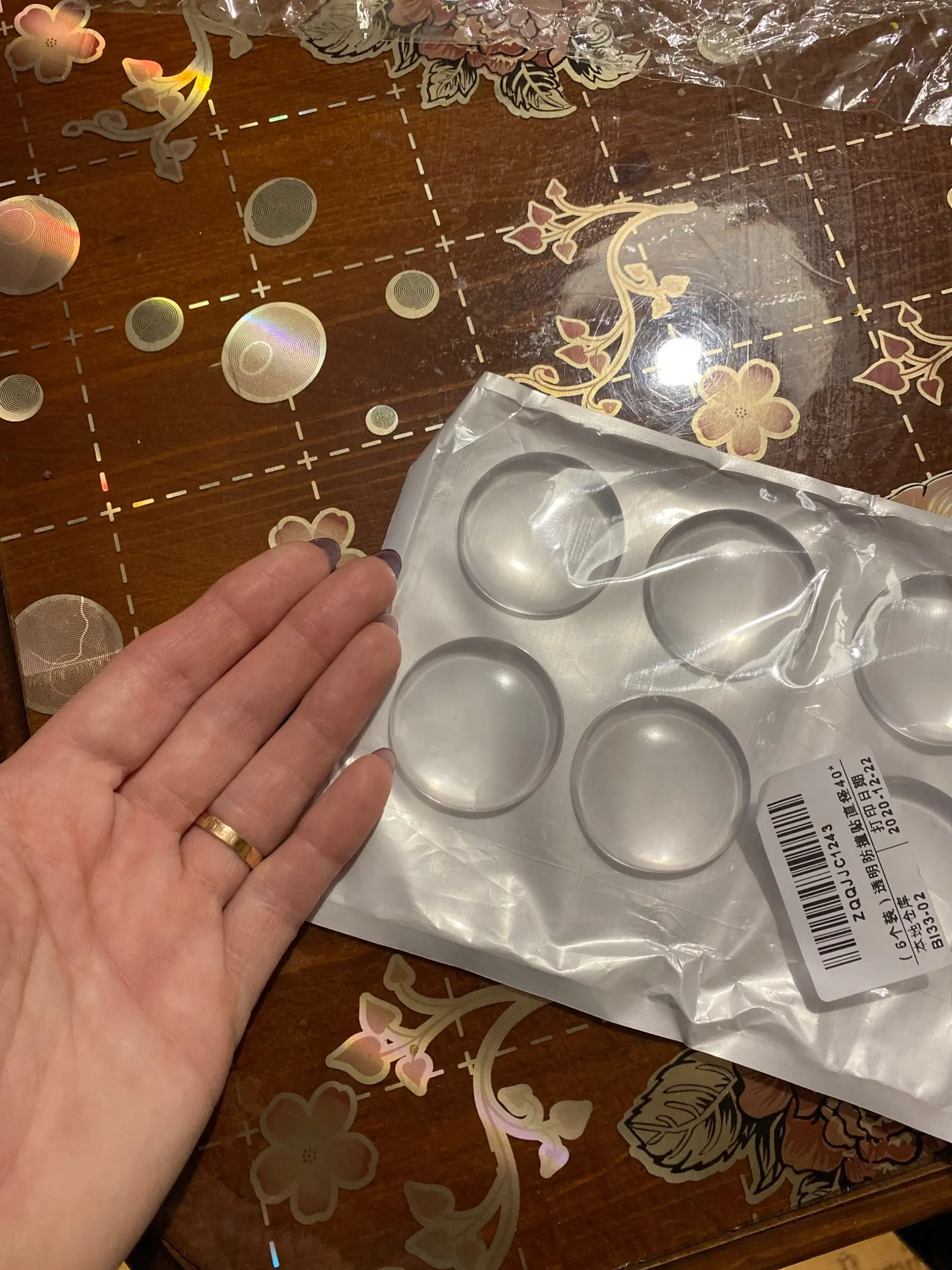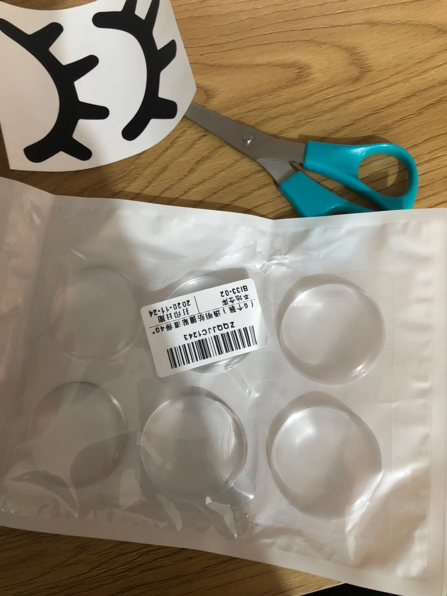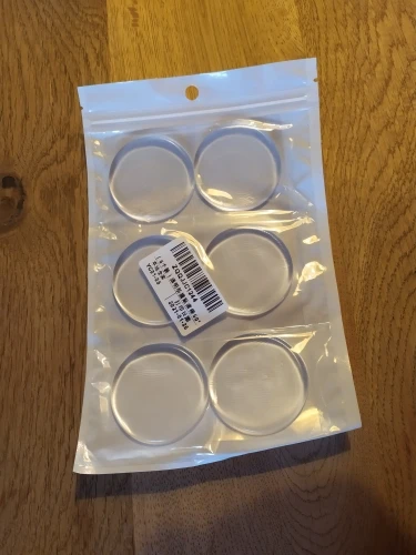 Compré estas gomas para pegar las en la pared y que la puerta no dejara huella de los golpes. Como es transparente apenas se nota