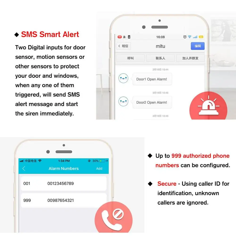 1. Никаких звонков. Открывалка GSM для ворот отклоняет вызов от авторизованного номера, затем выполняет действие включения/выключения на первом кольце; 2.это больше не является традиционным, чтобы открыть дверь, но более интересно открыть дверь, встряхнув ее. 3. Несколько приложений. (Ворота, болты, барьеры, гаражные ворота, жалюзи и двери доступа или машины); 4. Безопасное использование идентификатора вызывающего абонента для идентификации, неизвестные абоненты игнорируются; 5.можно управлять из любого места, без ограничения расстояния; 6.добавить или удалить пользователей с помощью SMS текстовой команды; 7. Нет необходимости предоставлять пульт дистанционного управления для разных пользователей; 8. Можно настроить до 999 авторизованных телефонных номеров; 9.два цифровых входа для дверного датчика, датчика движения или других датчиков для защиты вашей двери и окон, когда срабатывает любой из них, отправит sms-оповещение и сразу же запустит сирена; 10. Один выход с уровнем реле 6A/240VAC для подключения выключателя двери или машины; 11.действие реле вернет подтверждение SMS владельцу, эта функция редактируется пользователем; 12. На основе сети GSM, применяемой ко многим приложениям. 13. Добавление 2 проводных зонда для редактирования информации о сигнале и подключения дверной магнитной дымовой сигнализации.