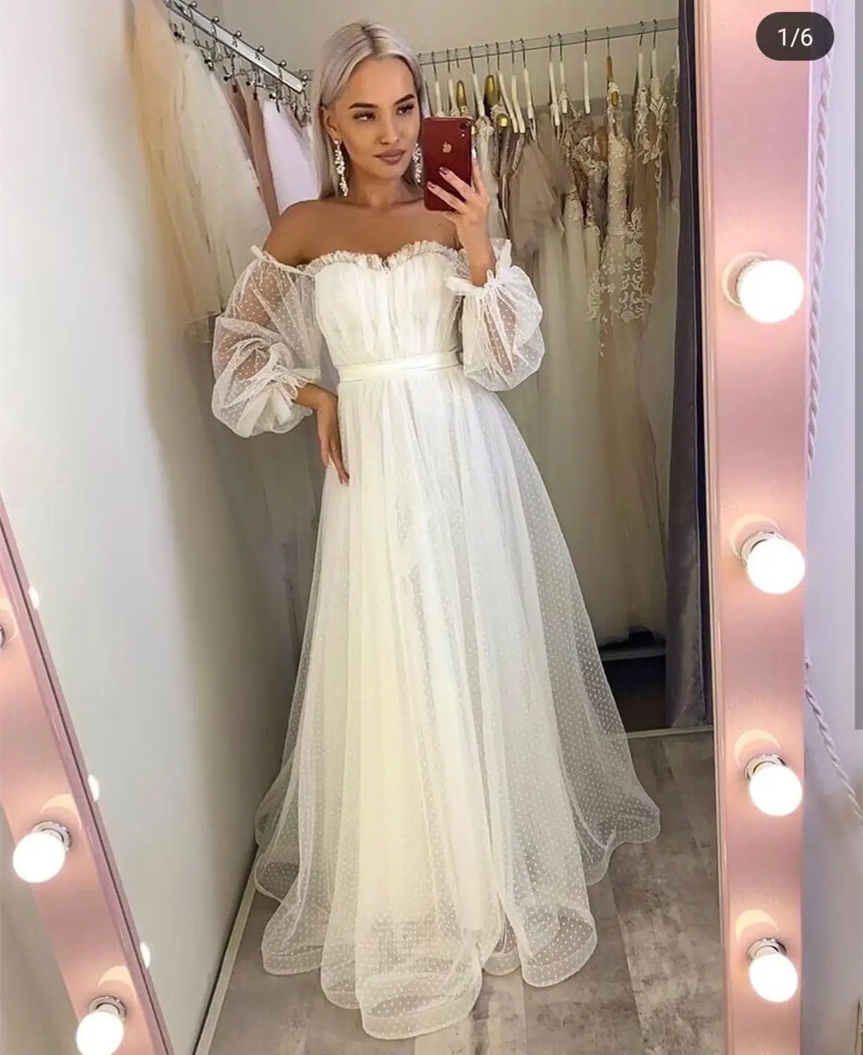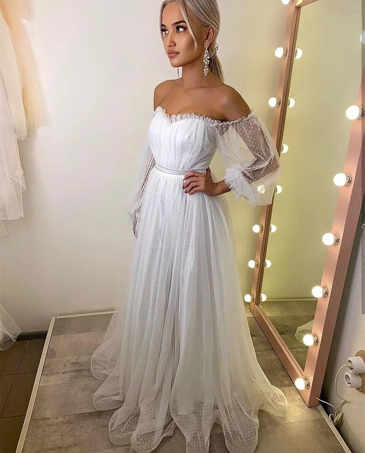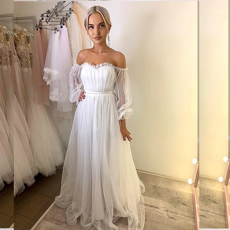 Женское свадебное платье с открытыми плечами, белое элегантное ТРАПЕЦИЕВИДНОЕ ПЛАТЬЕ С Длинным Рукавом-фонариком, из сетчатого тюля в пол, 2021