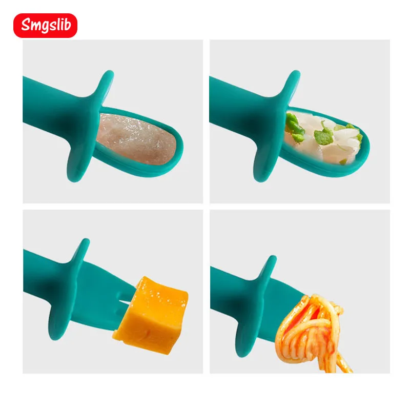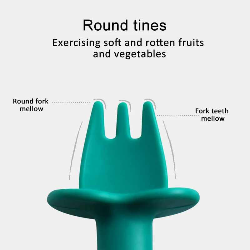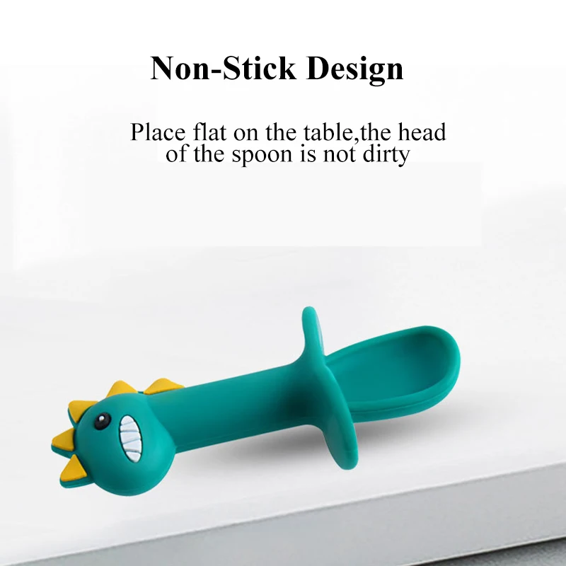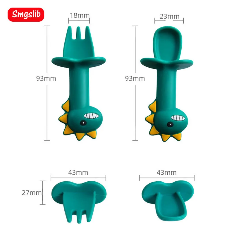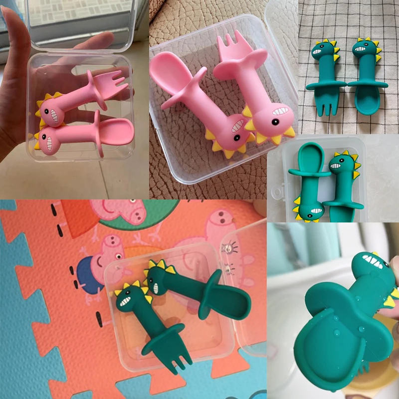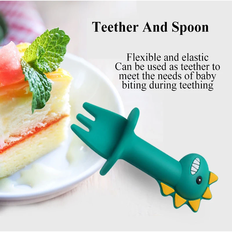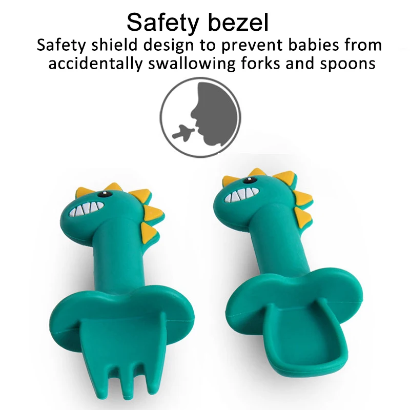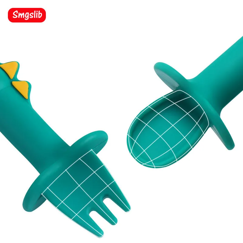 2 шт.компл. Детский обучающий набор ложка и вилка короткая легкая ложка мультяшный динозавр силиконовые прорезыватели игрушки противоскользящая тренировочная посуда для кормления