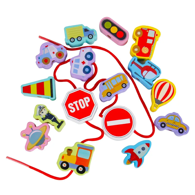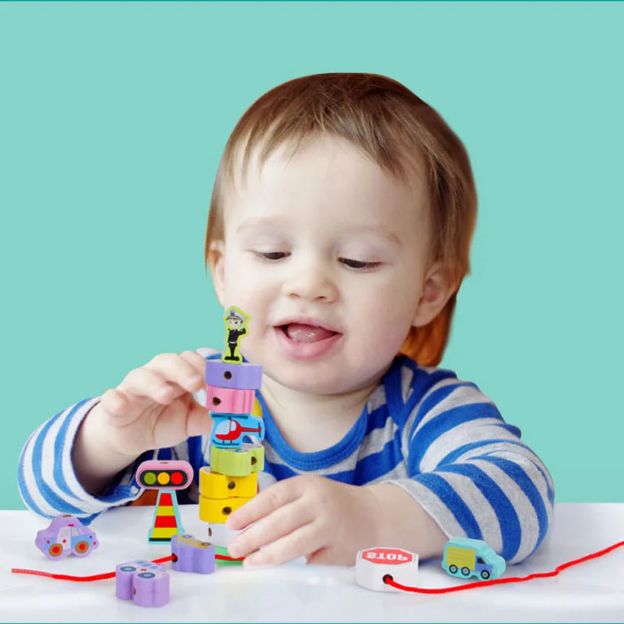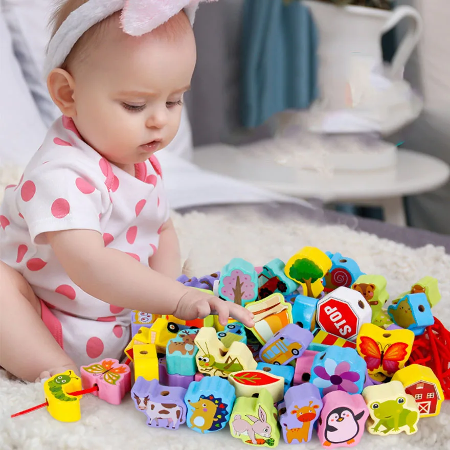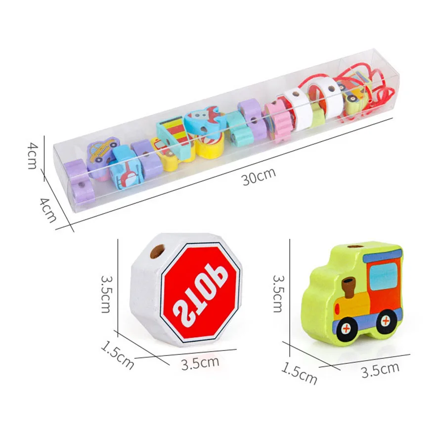 Деревянные строительные блоки бусы Детские игрушки Монтессори мультфильм красочные животные трафик ферма насекомых бисером веревка игра обучающая детская игрушка