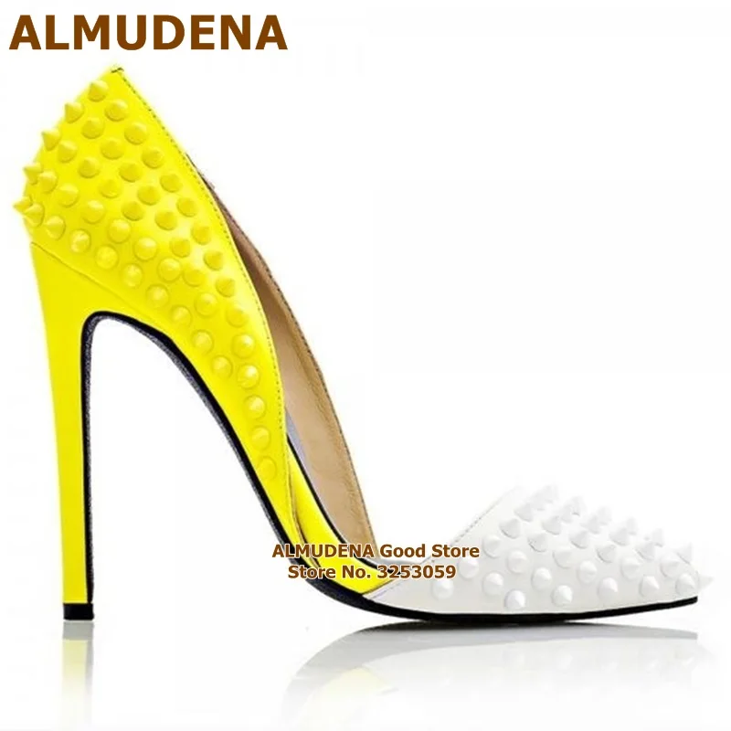 Туфли-лодочки с острым носком almuтеннисные желтые, розовые с заклепками, на высоком каблуке модельные туфли-лодочки в стиле пэчворк на шпильках для вечеринки