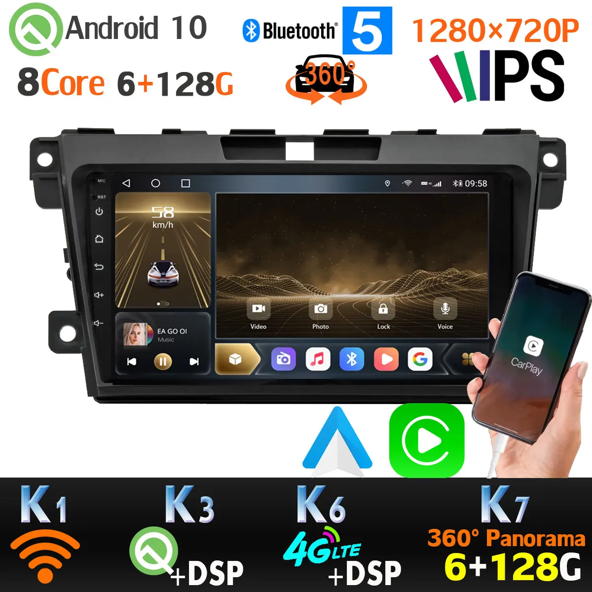 Головное устройство для панорамной камеры, 6 + 128G, Android 10, 1280x720, автомобильный проигрыватель с радио и GPS, для Mazda CX-7, CX7, CX 7, 360, CarPlay, SPDIF, авто, 4G, LTE
