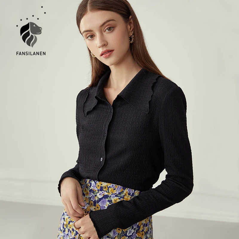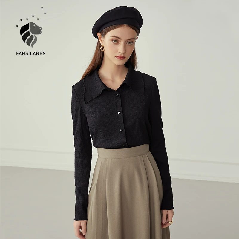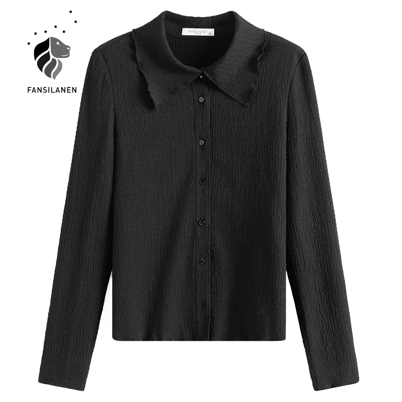 Женская винтажная блузка FANSILANEN, черная офисная блузка с длинным рукавом, Повседневная рубашка на пуговицах