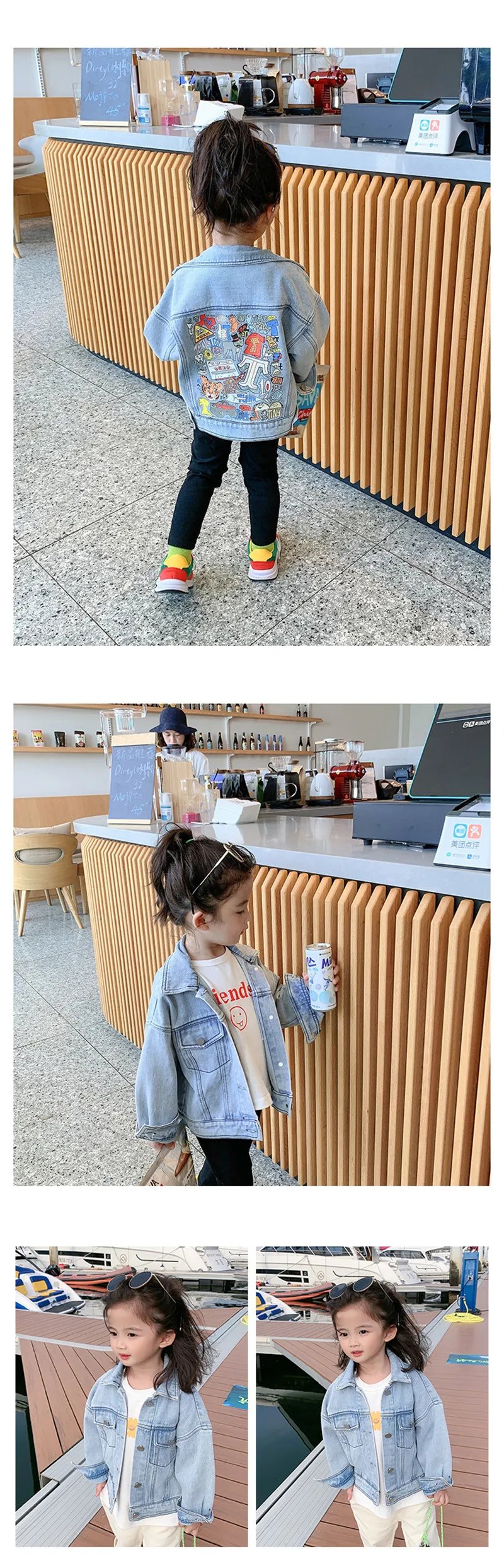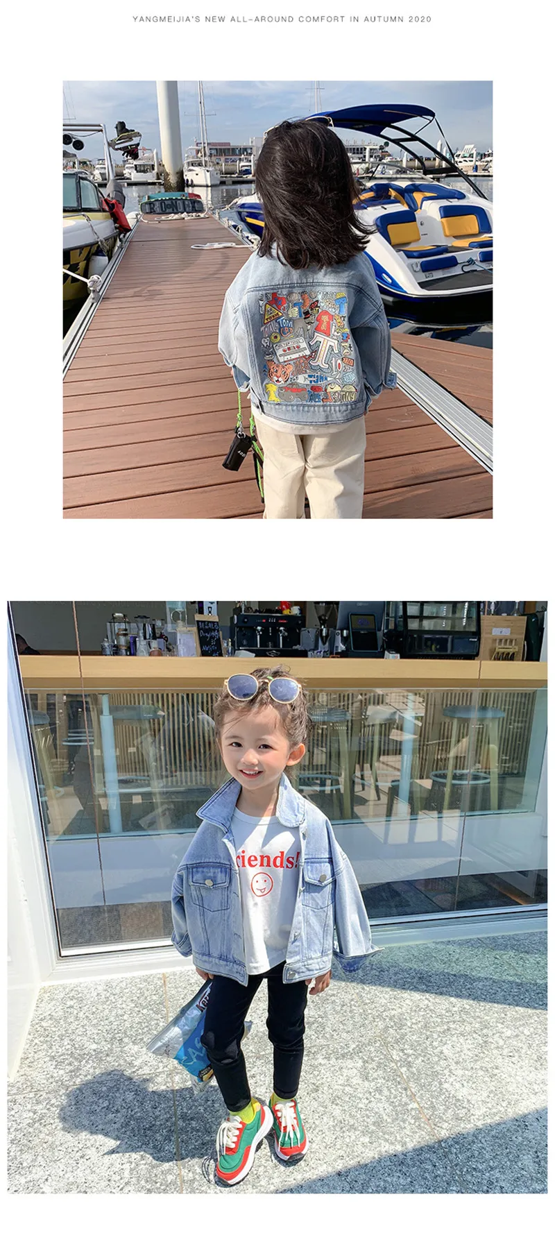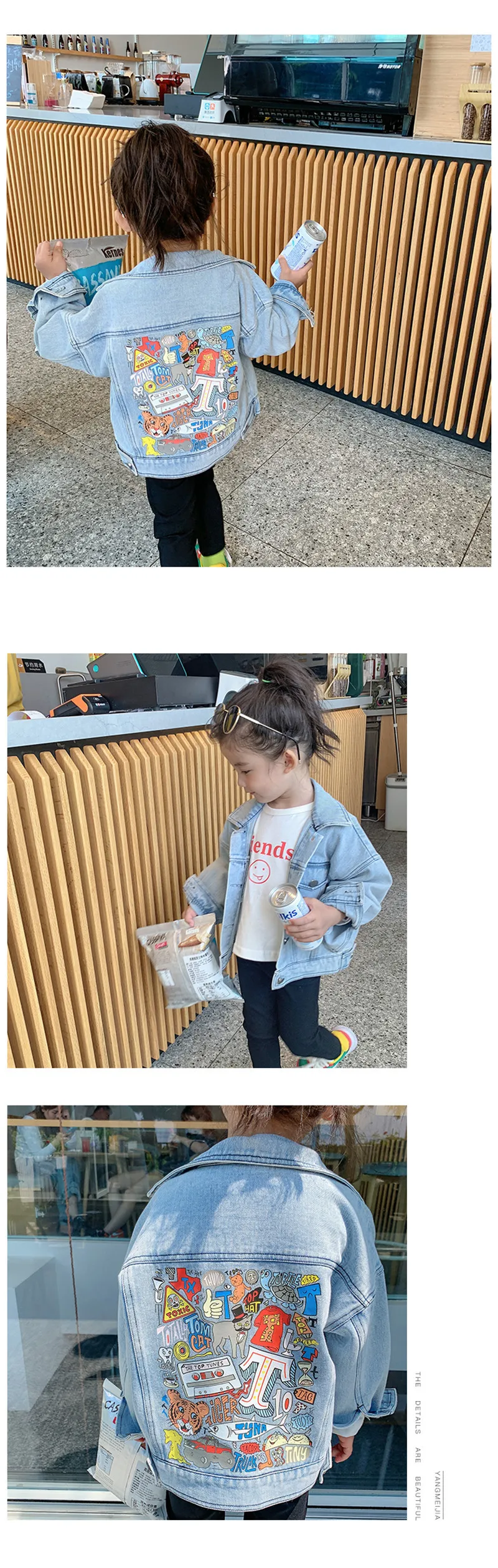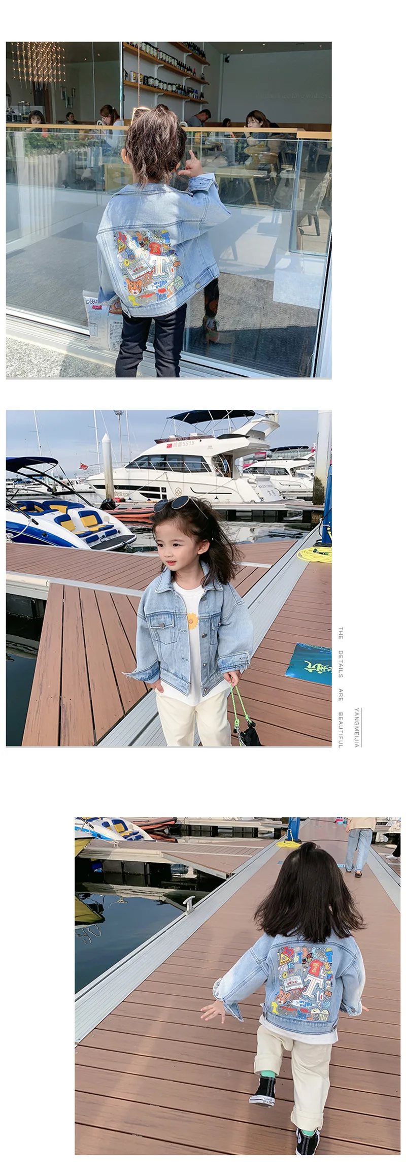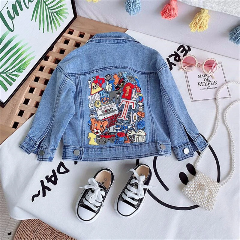 Модная синяя джинсовая куртка для маленьких девочек, осенняя одежда для детей, весеннее пальто с мультяшным принтом для мальчиков, верхняя одежда, 2022