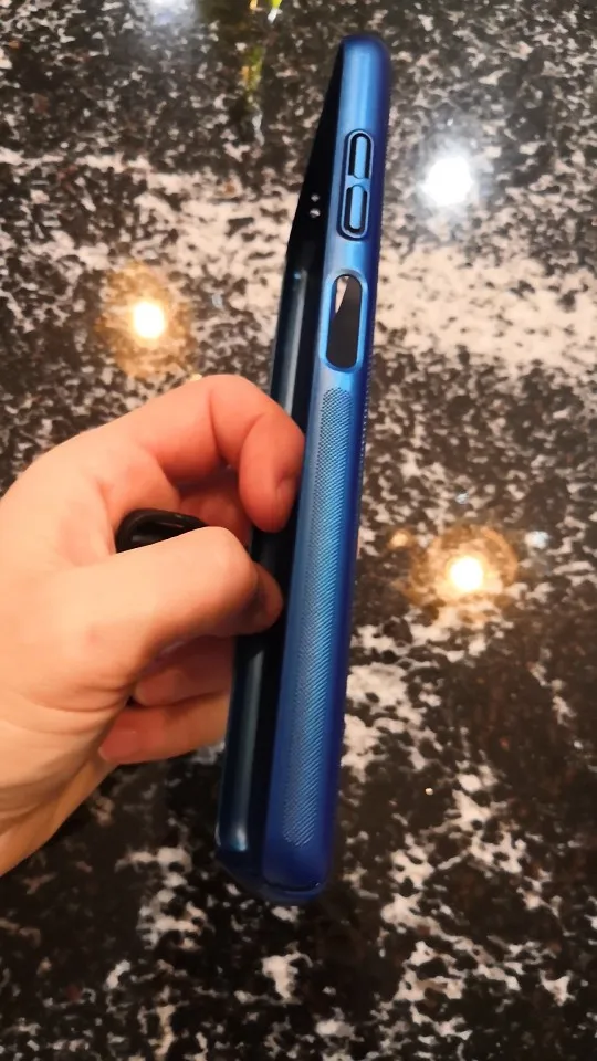 Хороший чехол. Сидит плотно, чуть тоньше чехла который шел в комплекте. Пластик какой-то прорезиненный, очень цепки, особенно в перчатках удобно. Кнопки громкости сделаны хорошо, щёлкают четко. Над экраном и камерами выступы. В целом очень удобный.