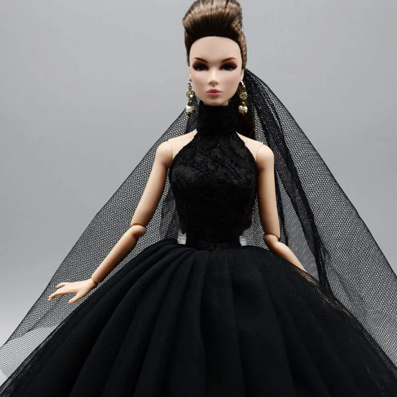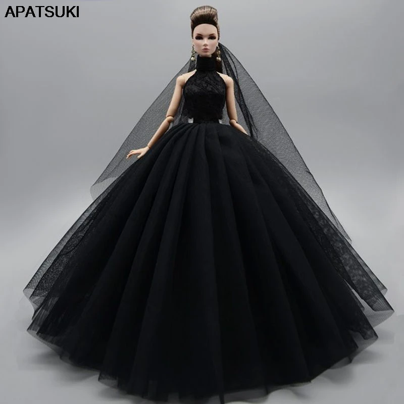 Черное свадебное платье с высоким воротом для куклы Барби, наряды принцессы, Вечернее Длинное нарядное платье, платья, кукольная одежда и вуаль, 16