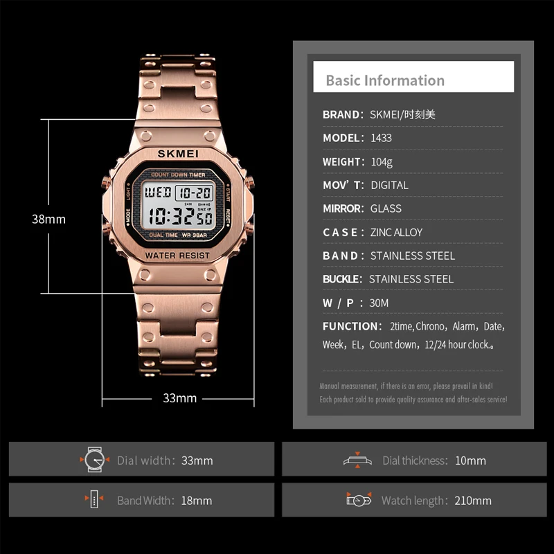Часы SKMEI 1433 (женские-покупал жене) выглядят лучше чем на фотографии. Изготовлены очень добротно, лишний раз убеждаюсь, что бренд SKMEI может делать качественные вещи по разумной цене. Корпус и браслет - металл. Циферблат читается хорошо, ничего лишнего, оригинальная оранжевая подсветка. Быстрая доставка AliExpress Standard Shipping в Амурскую область - 16 дней. Трек-номер отслеживается на всём протяжении пути. Спасибо продавцу Skmei Watch Store. Рекомендую!