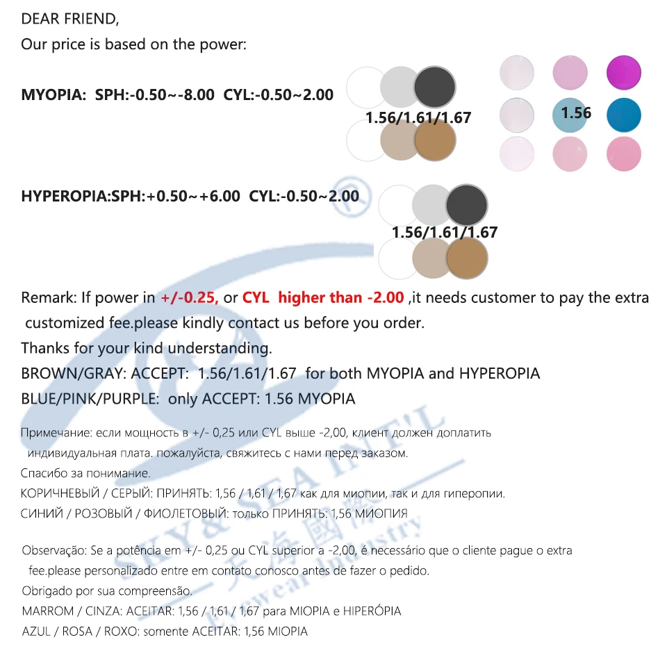 Примечание:Если мощность +/-0,25 или CYL выше-2,00, требуется, чтобы клиент заплатил дополнительную плату по индивидуальному заказу.