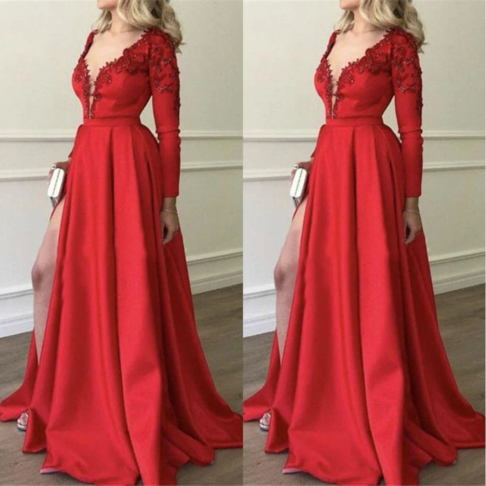 Индивидуальное ТРАПЕЦИЕВИДНОЕ ПЛАТЬЕ с аппликацией из бисера с V-образным вырезом для выпусквечерние вечера, новое женское атласное красное вечернее платье до бедра с длинным рукавом и разрезом