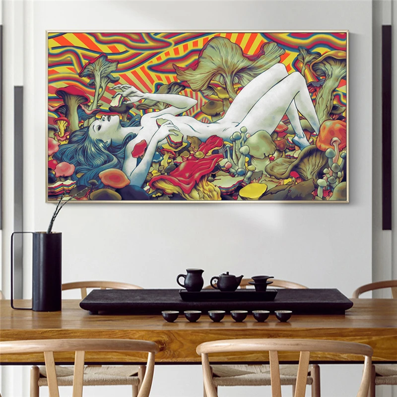Абстрактная Обнаженная девушка, лечь на Триппи гриб, печать на холсте, настенная живопись, Постер и украшение для гостиной принты, искусство, картина