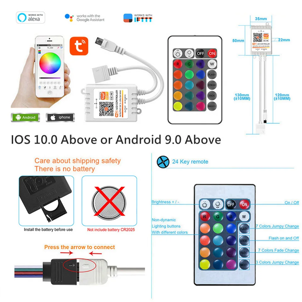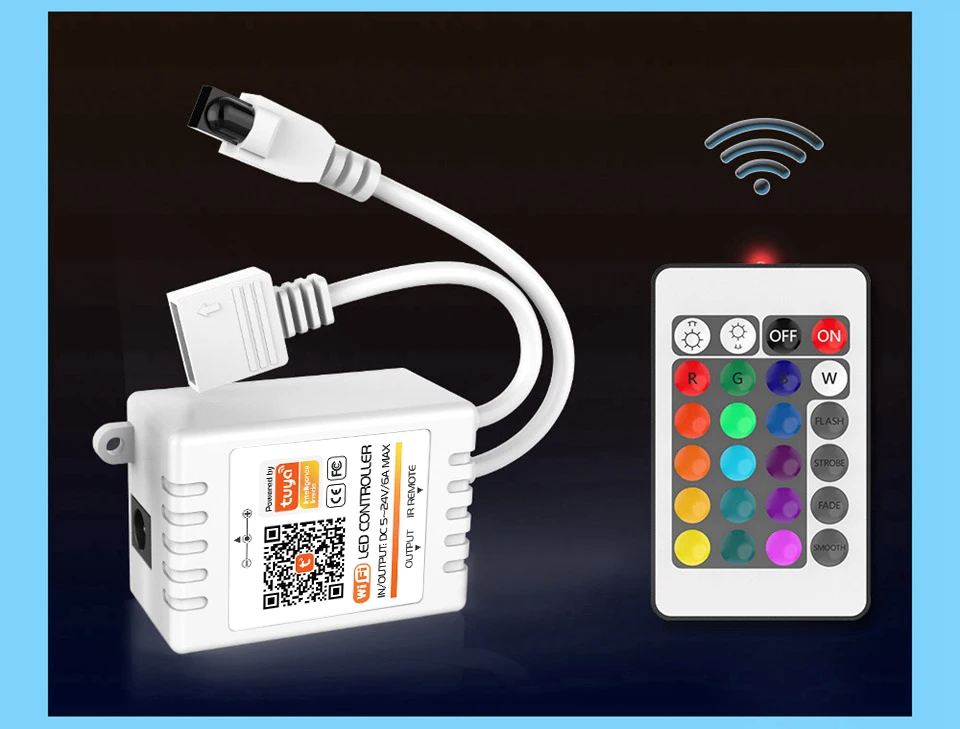 * 5050 RGB светодиодные лентыТип СВЕТОДИОДА: SMD 5050 (имеет белый свет)Количество: 5 м 30 светодиодов/метрРабочее Входное напряжение: 12 В постоянного токаРабочая температура: -20 ° ~ 60 °Уровень водонепроницаемости: IP65 Водонепроницаемый или IP20 не водонепроницаемый * 2835 RGB светодиодные лентыТип СВЕТОДИОДА: SMD2835 (без белого света)Количество: 5 м 54 СВЕТОДИОДА/метрРабочее Входное напряжение: 12 В постоянного токаРабочая температура: -20 ° ~ 60 °Уровень водонепроницаемости: IP65 Водонепроницаемый или IP20 не водонепроницаемый • Контроллер Wi-FiВес нетто: 45 гВес брутто: 60 гВходное напряжение: DC5 ~ 24 ВВыход: 3 канала (RGB)Выходной ток: 6А (3 x 2A/каждый канал)Выходная мощность: 5 в <30 Вт, 12 В <72 Вт, 24 В <144 ВтМетод управления: управление через приложение/ИКИК-пульт дистанционного управления: 24KeyВнешний размер: L85 * W52 * h7ммНазвание приложения: Tuya Smart