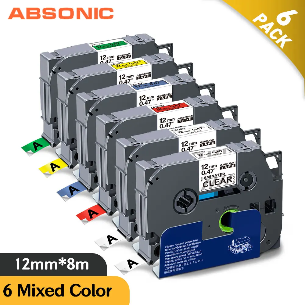 Absonic 6PK смешанные цвета TZ-231 tz231 12 мм ламинированная этикетка лента черный на белом Совместимость для 231 Brother Ptouch 231 Label Maker
