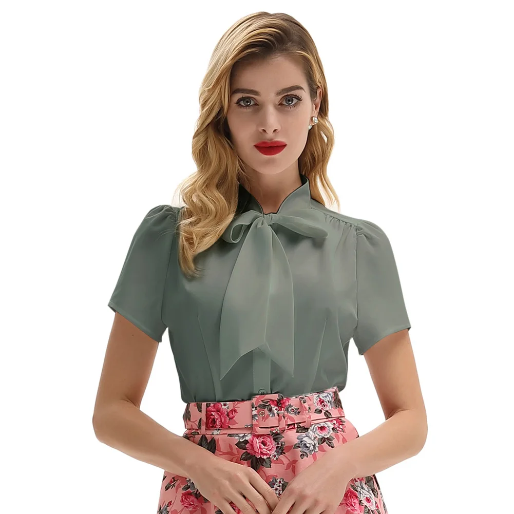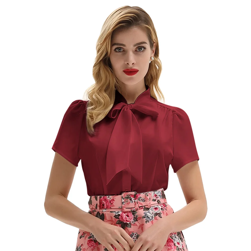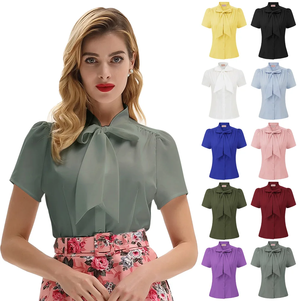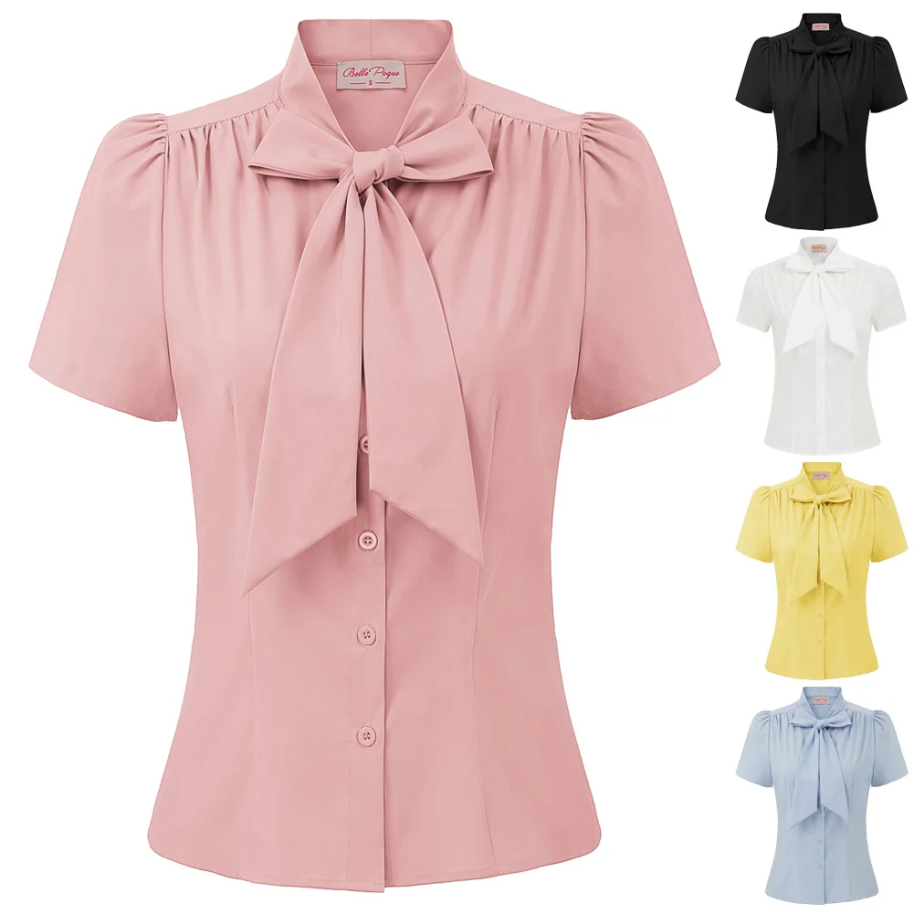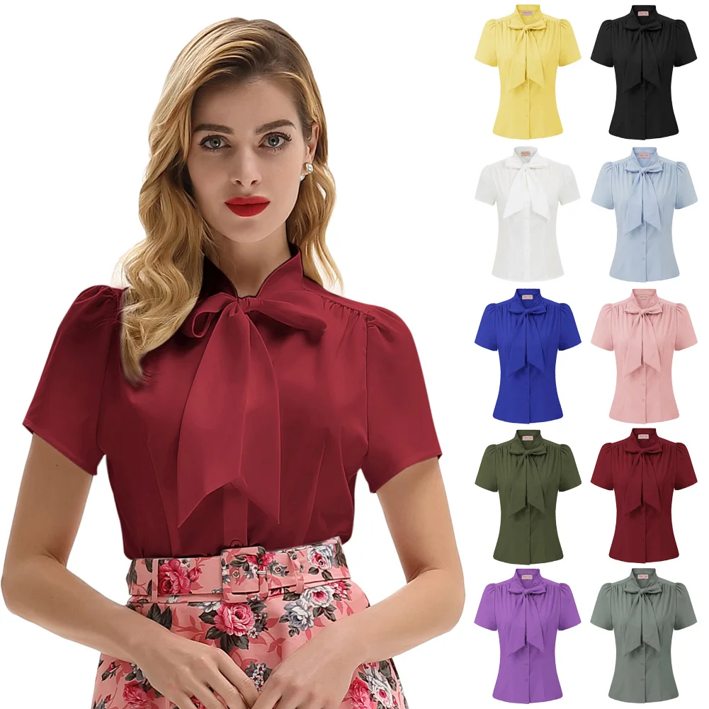 Женская рубашка с коротким рукавом, с бантом, в стиле ретро