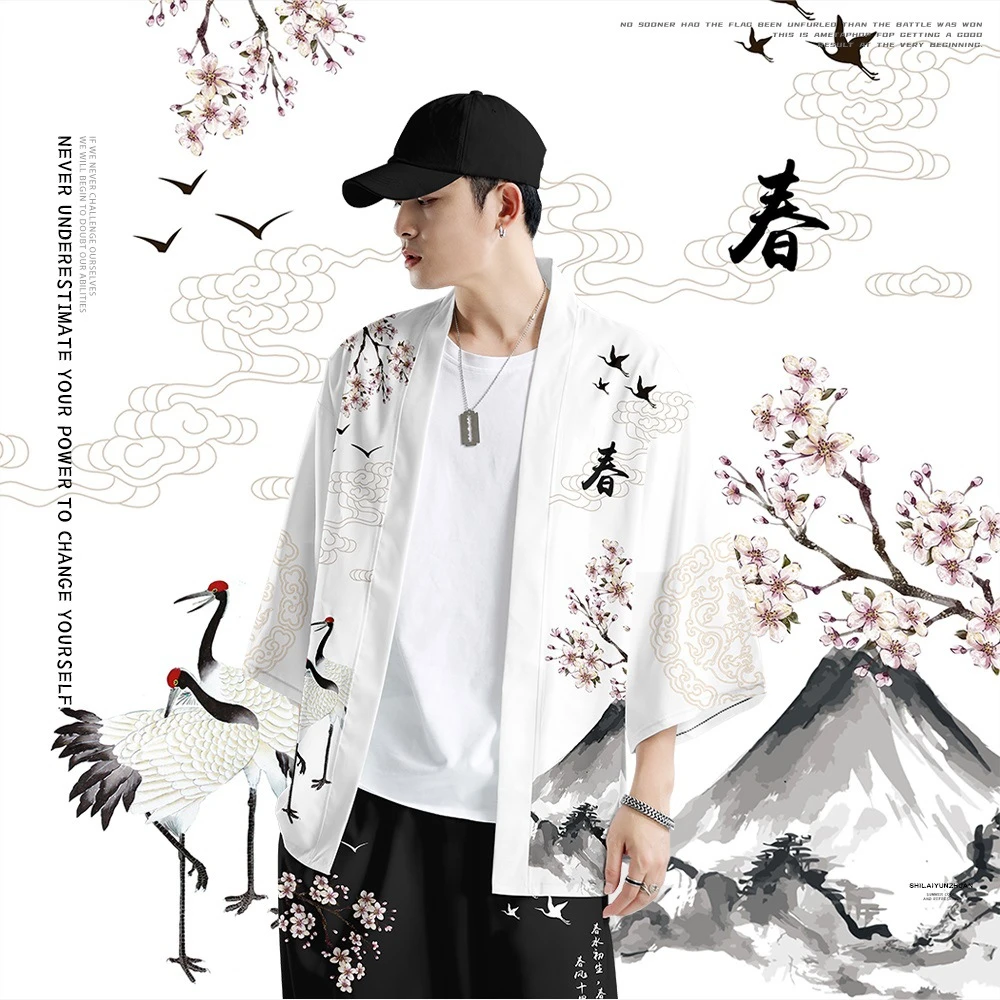 Yukata кимоно мужская Японская уличная одежда женский мужской кардиган с принтом журавлей Haori для взрослых мальчиков и женщин мужские брюки с эластичной резинкой на талии повседневный комплект одежды