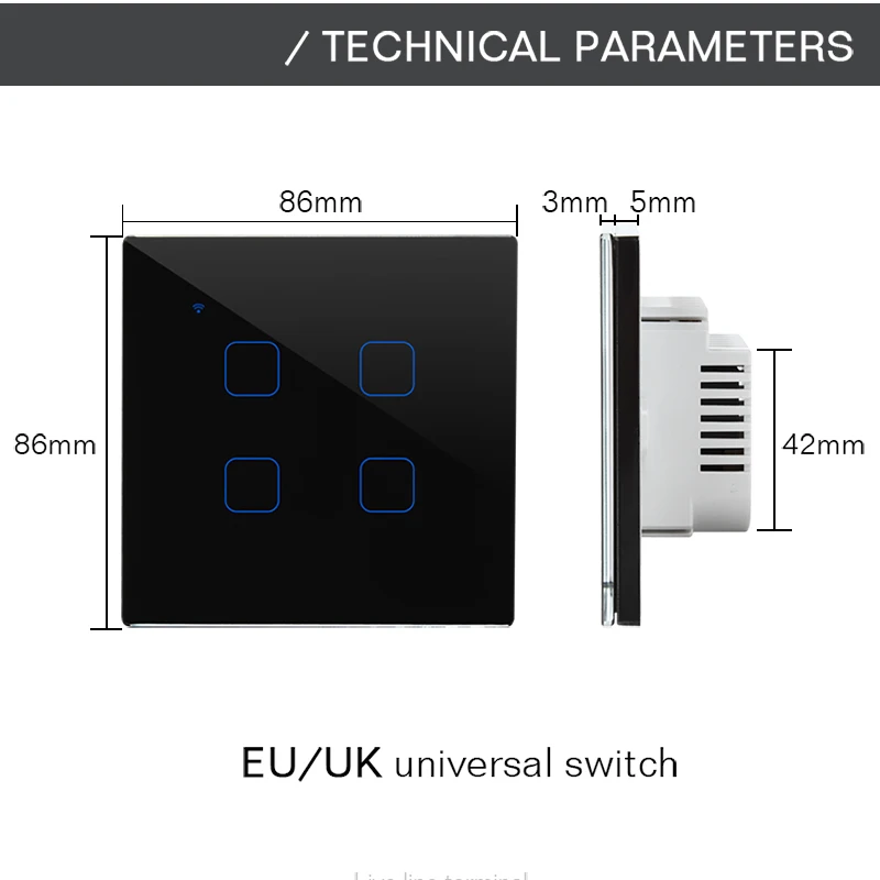1. Модель: сенсорный переключатель WiFi2. Напряжение (требуется нейтральная линия):100-240 В3. Беспроводной Стандартный: Wi-Fi 2,4 ГГц4. Рабочая среда: 0 ℃ ~ 40 ℃; Менее 95% RH5. Материал: закаленное Хрустальное стекло + пластик6. Срок службы: 100000 время Управление