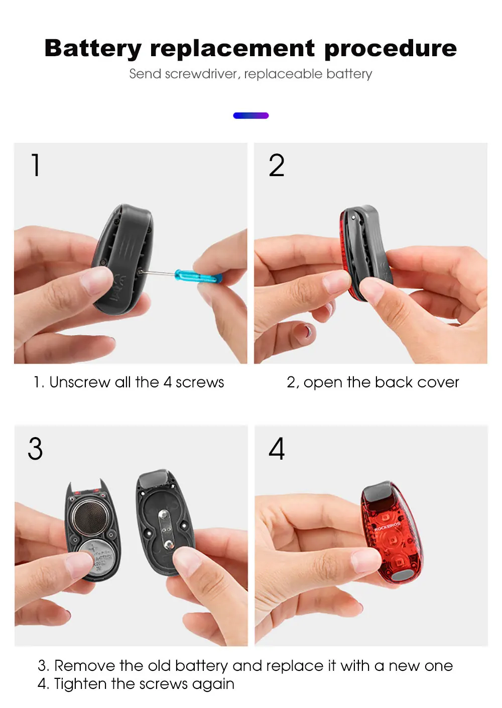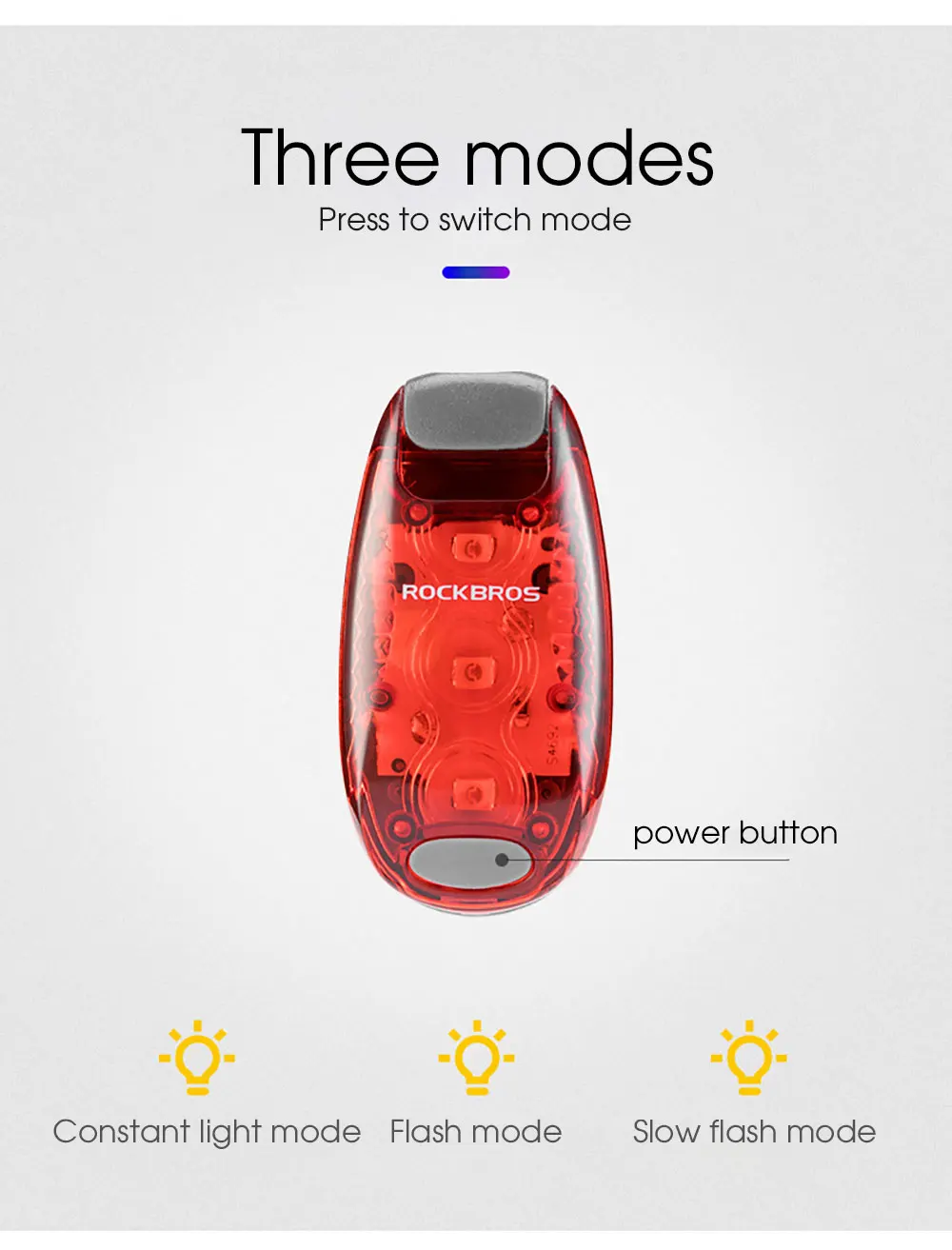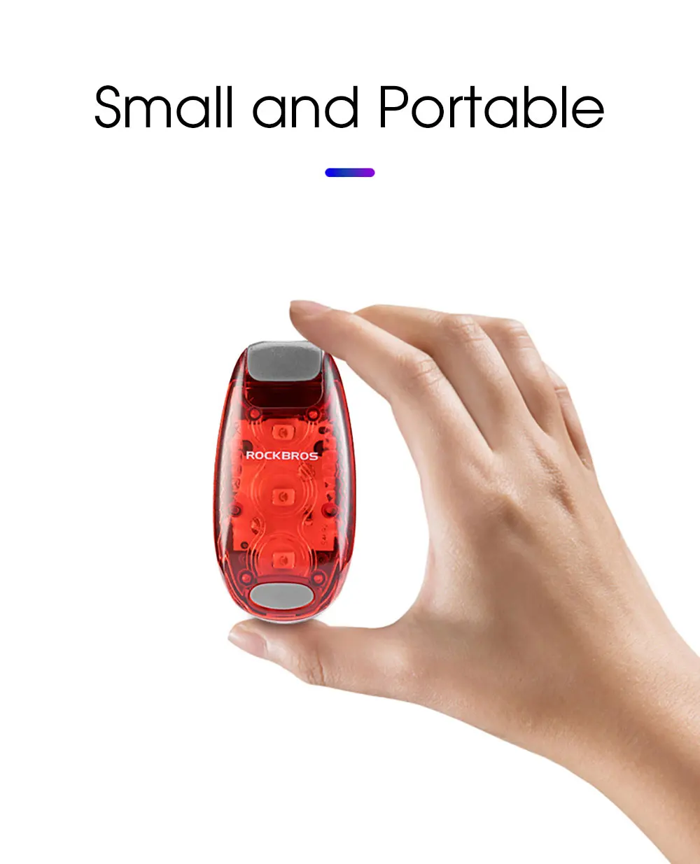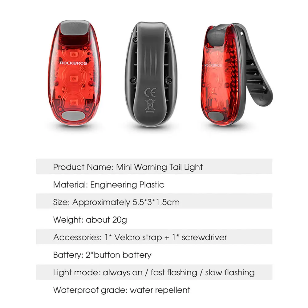 Бренд: ROCKBROSРежим: 3 режима яркий/вспышка/медленная вспышкаВес: около 20 гРазмеры: около 5,5*3*1,5 смХарактеристики: мини портативный, подходит для нескольких сценариев, предупреждение безопасности