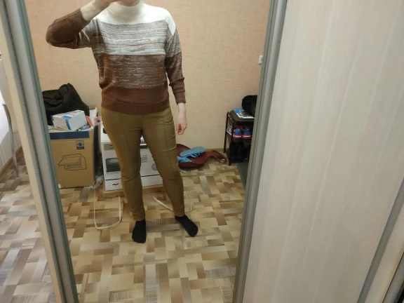 Брючки хорошие, тёплые. Размер S подошёл на рос. 40. Длинна на рост 155 нормальная. Но сильно тянутся, морщат по всей ноге.