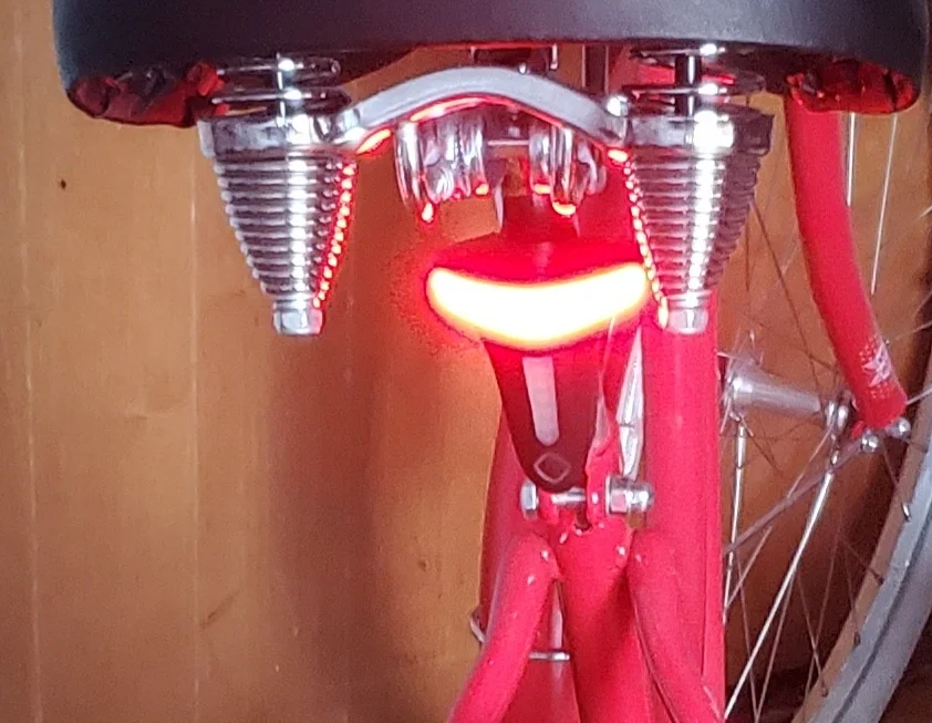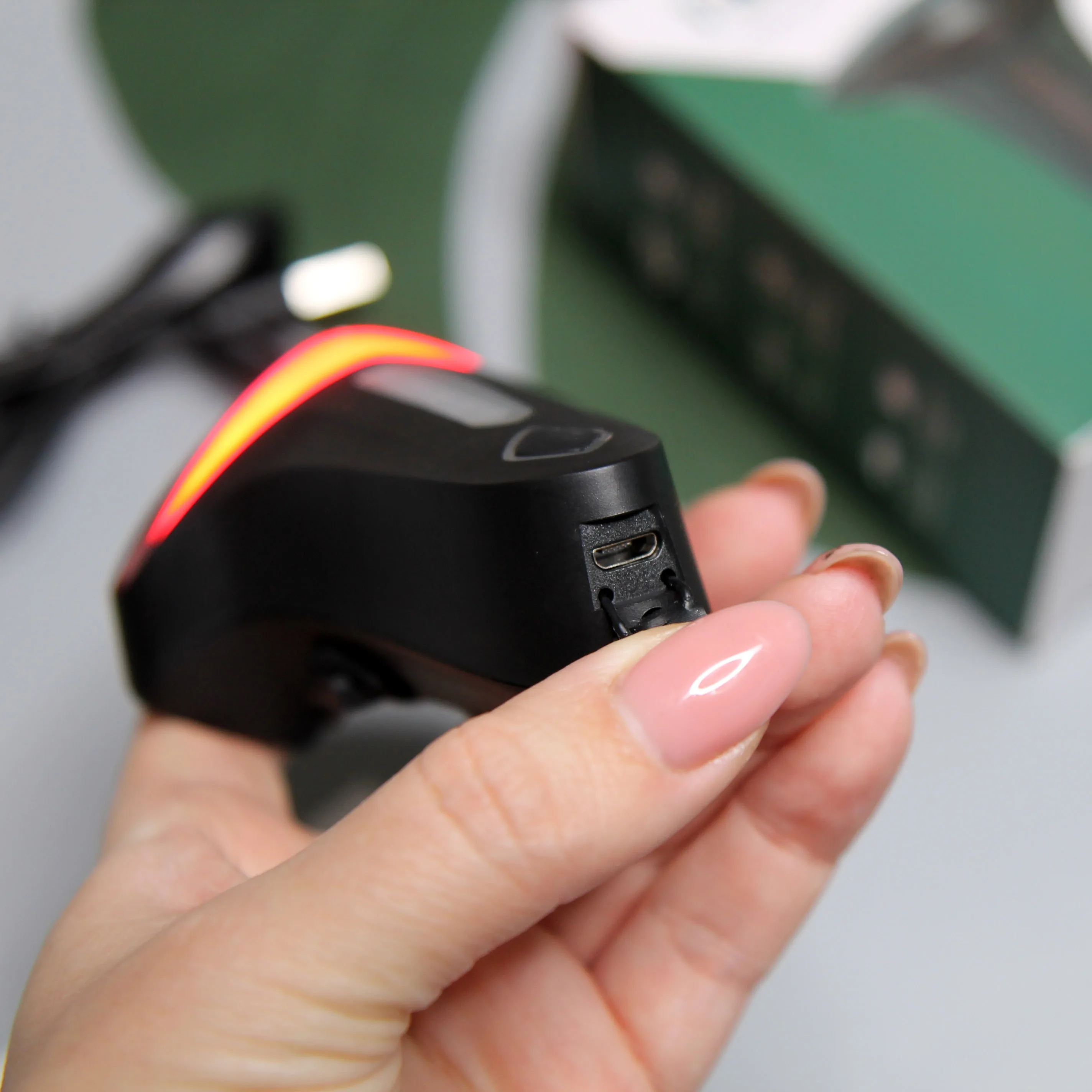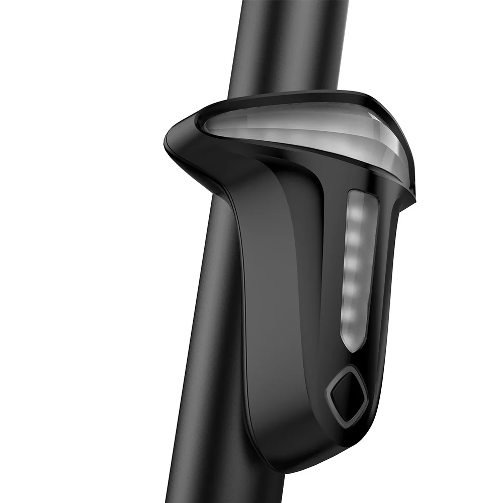 Работает от аккумулятора на 1400 mAh, заряжается через разъем micro-USB. Фонарь имеет защиту IPX6 - защита от водяных потоков или сильных струй с любого направления. Всего 5 режимов, переключаем их с помощью кнопки. Верхние светодиоды работаю всегда, только меняется интенсивность мигания при смене режимов, а нижняя полоска светодиодов включается при остановки велосипеда, благодаря встроенному датчику ускорения, она очень ярка и вас заметят все. Есть функция когда велосипед упадёт на землю, то фонарь сделает специальные сигналы для других участников движения.