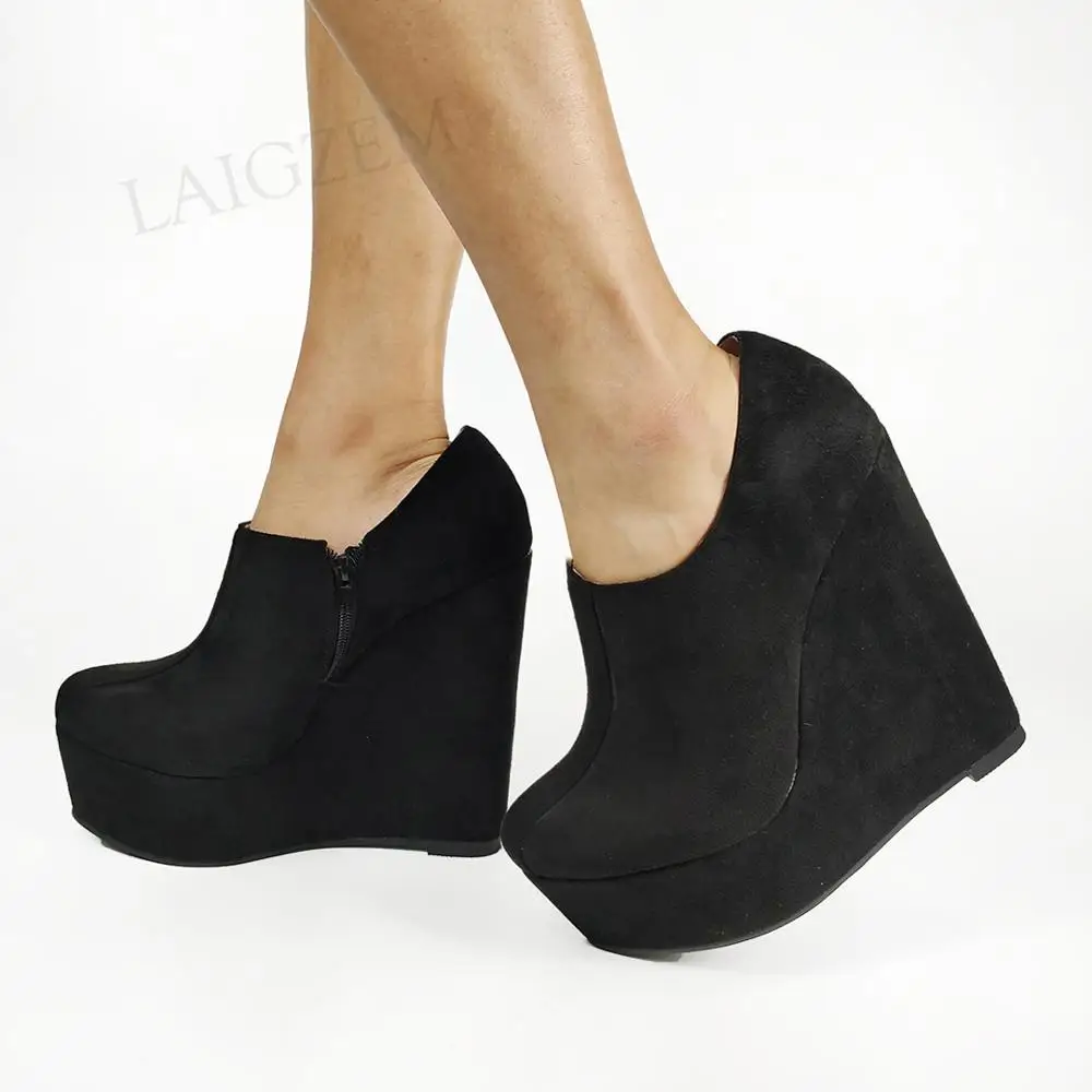 SEIIHEMженские ботильоны на платформе и танкетке; Черные ботинки на высоком каблуке с боковой молнией; Обувь для увеличения роста; Женская обувь; Большие размеры 43, 44, 50, 52