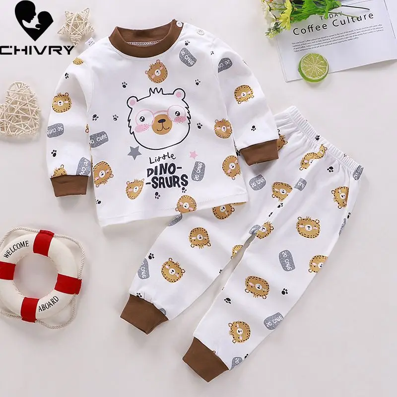 Новинка 2021, пижамный комплект для мальчиков и девочек, Милая футболка с длинным рукавом и мультяшным принтом и штаны, осенняя одежда для сна для малышей