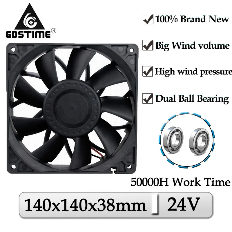 Gdstime DC 24 В 140x140x38 мм 140 мм двойной шар высокого давления ветра 2PIN чехол для компьютера ПК кулер безщеточный вентилятор охлаждения постоянного тока