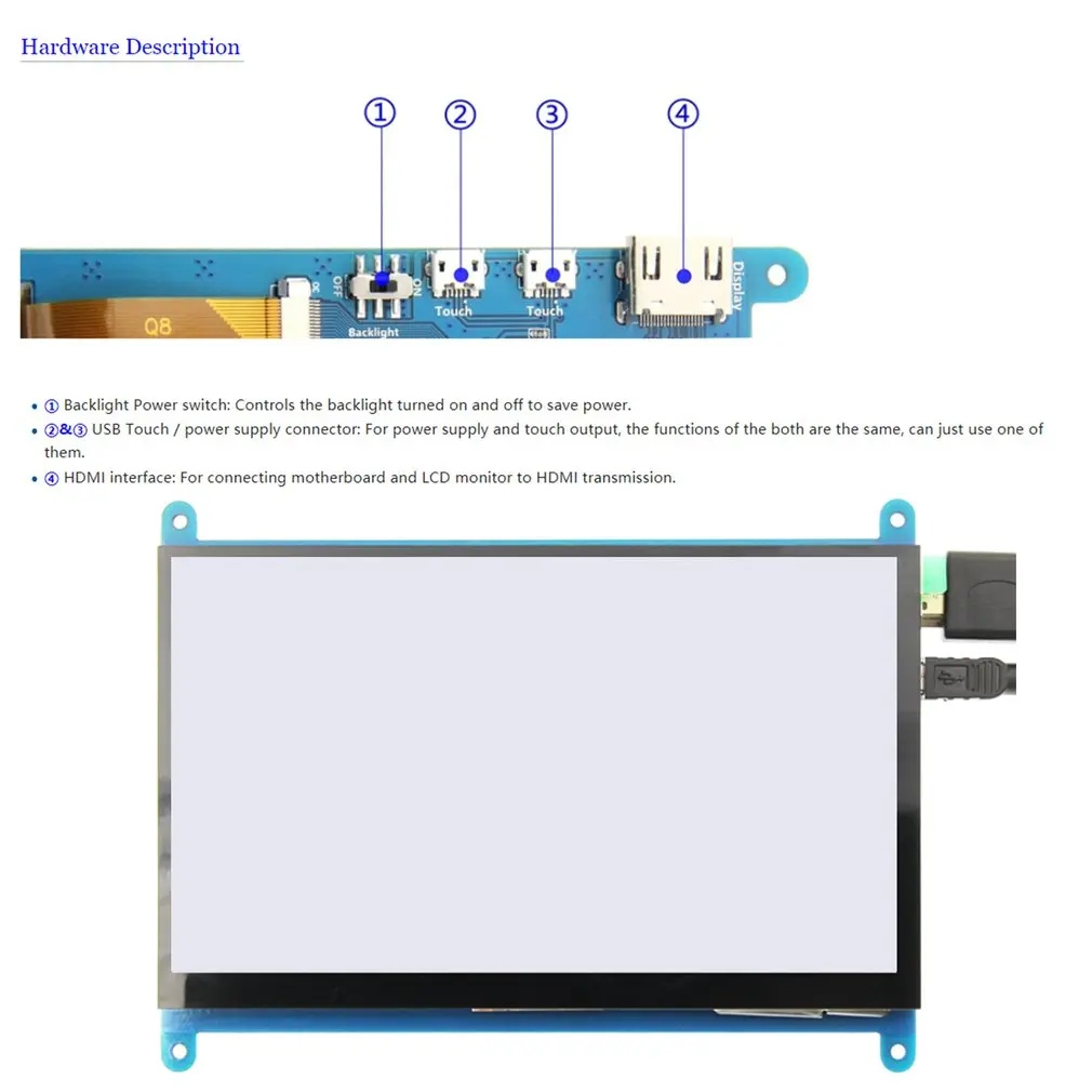 Особенности:1. 7 дюймов стандартного отображения, 1024 × 600 Аппаратное Разрешение до 1920x1080 конфигурации программного обеспечения.2. Емкостный сенсорный экран, максимальная поддержка 5-точечного касания3. Поддерживает только управление подсветкой, подсветку можно выключить, чтобы сохранить питание4. Поддержка Raspberry Pi, BB Black, Banana Pi и других основных мини-ПК5. Может использоваться в качестве монитора HDMI общего назначения, например: подключение к компьютеру HDMI в качестве поддисплея Описание:При использовании ЖК-дисплея для Raspberry Pi сначала необходимо изменить разрешение, что довольно просто.Отлично, экономит место, легко снимается с Raspberry Pi.Характеристики:Размер: 7,0 (дюйм)Разрешение: 1024 × 600 (точки)Сенсорный: 5-точечный емкостный сенсорныйРазмер изделия: 164,9*124,27 (мм)Размер посылка: 211*150*53 (мм)Приблизительный вес (посылка содержит): 405 (г)Рассеивание мощности: 0.84A * 5VТип: для Raspberry Pi 4 Model B, для Raspberry Pi 3B +/3B/2B/B +Информация о продукте: http://www.lcdwiki.com/7inch_HDMI_Display-C (копия в браузер открывается)Посылка включает в себя:7 дюймов HDMI Дисплей x1Кабель HDMI x1USB кабель x1Медная колонна посылка (4 шт.) x1Диск данных x1Руководство пользователя x1Примечания:1. Допускается погрешность в 1-3 см.2. Цвет фактического товара может незначительно отличаться от приведенного выше изображения из-за различий в экране компьютера, спасибо за понимание.