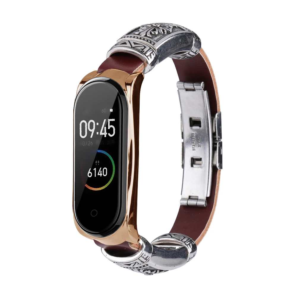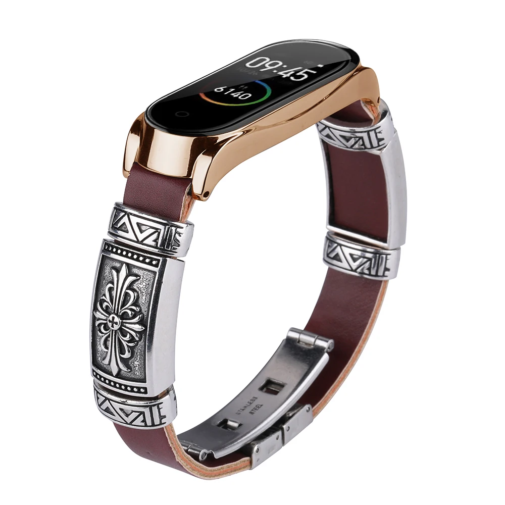 Браслет для Mi Band 3/4, ретро браслет из натуральной кожи, ремешок для Xiaomi Mi Band 5, аксессуар с металлическим корпусом, ремешок для часов