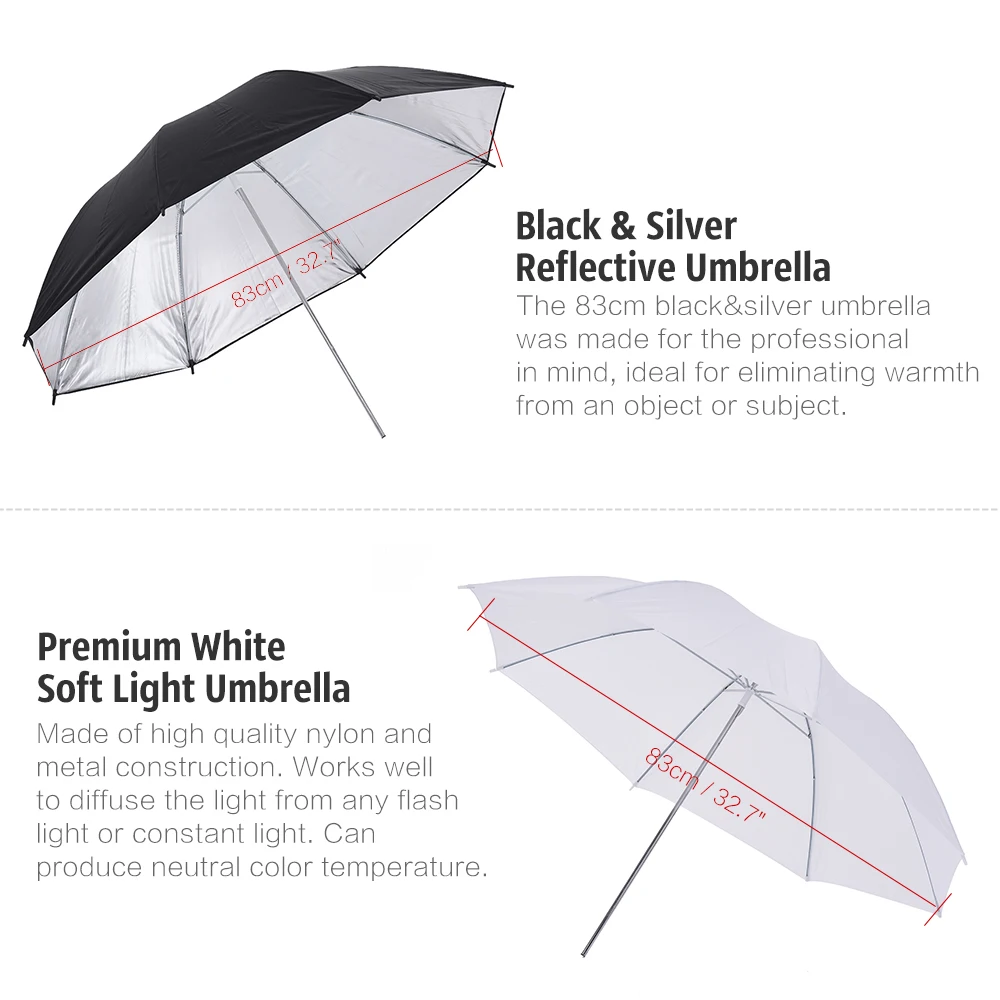 Особенности: Набор для фотостудии Andoer включает в себя 2 шт. 2 м светильник, 2 шт. 83 см полупрозрачные белые зонты мягкого света, 2 шт. 83 см черные и серебряные зонты, 2 шт. скобы b-типа shoemount и 1 шт. сумка для переноски. Этот профессиональный студийный комплект идеально подходит для съемки со вспышкой speedlite. Мягкий прозрачный белый зонтик длиной 83 см обеспечивает отличный тон кожи и контрастный контроль. 83 см черный и серебряный зонтик был сделан для профессионального ума, идеально подходит для устранения тепла от объекта или предмета. Кронштейны Shoemount b-типа разработаны с универсальным адаптером для холодного башмака для использования с портативными вспышками, такими как для Canon или для Nikon Speedlight. Кронштейн типа B, универсальный и простой в использовании, поможет вам достичь качества фотографии, которое вы желаете. Светильник 2 м изготовлен из алюминиевого сплава, придавая ему исключительную прочность для тяжелой работы. Поставляется с сумкой для переноски Andoer 1 шт. для хранения комплекта для фотосъемки, который изготовлен из прочного и прочного нейлонового материала, сверхпрочного и ударопрочного. Технические характеристики: -83 см полупрозрачный белый мягкий Зонт * 2: Материал: нейлон, алюминиевый вал Диаметр: 83cm / 32.7in Длина в сложенном виде: 57 см -- 83 см черный и серебряный светоотражающий Зонт * 2: Цвет: черный снаружи, серебристый внутри Диаметр: 83cm / 32.7in -- 2 м светильник-подставка * 2: Материал: Алюминий из алюминиевого сплава Максимальная грузоподъемность: 3 кг Рабочая высота: 75 см ~ 200 см Высота в сложенном виде: 67 см Интерфейс сверху: стандартный интерфейс крышки, универсальный для большинства видео светильник, съемочный светильник ing, держатель светильник и т. Д. -- Кронштейн b-типа Shoemount * 2: Размер Горячий башмак можно регулировать (17-23 мм) Есть гнездо 5/8 "для крепления вспышки на подставку-светильник. Полезный светильник для вспышки для ваших камер, который регулируется для широкого спектра вспышек горячего башмака. Подходит для: почти всех вспышек горячего башмака (Но не для Sony, а не для бренда Minolta.) -- Сумка для переноски * 1: Торговая марка: Andoer Материал: нейлон Цвет: черный Посылка Размеры: 72*19,5*18,5 см/28,4*7,7 * 7.3in Вес посылка: 3440 г/121,3 унций Посылка список: 2*2 м светильник стенд 2 * прозрачный белый мягкий зонт 2 * черный и серебряный зонт 2 * кронштейн типа B для вспышки Speedlite 1 * сумка для переноски Andoer Примечание: Вспышка в комплект не входит.