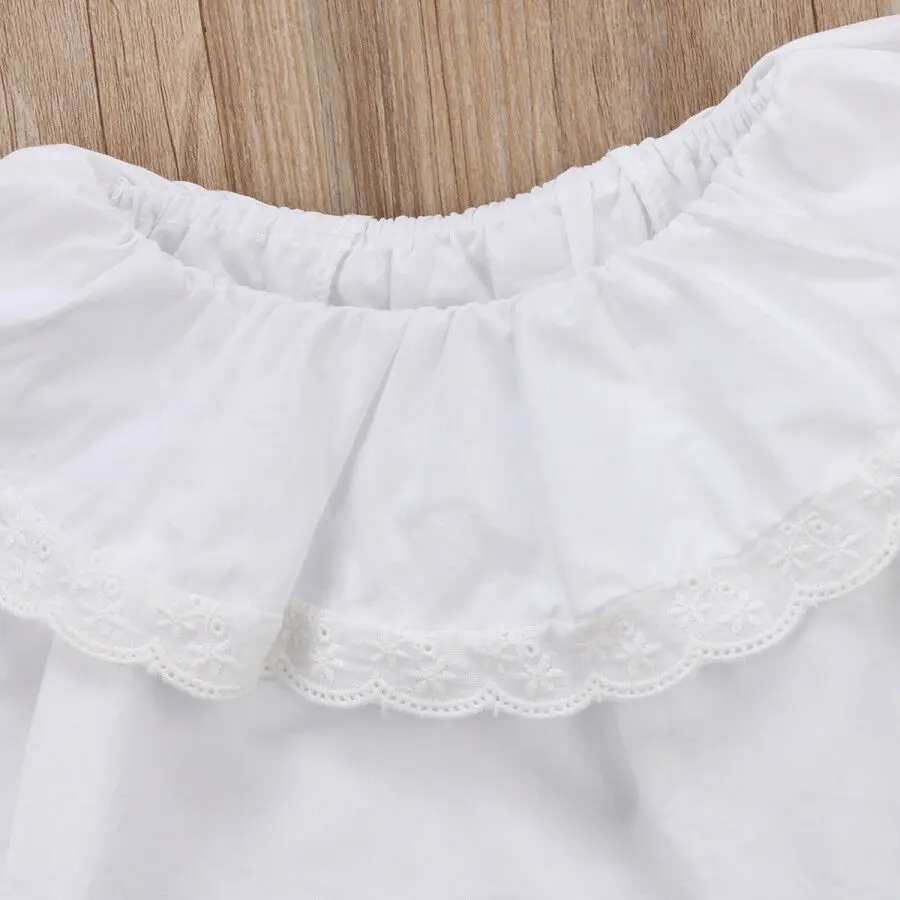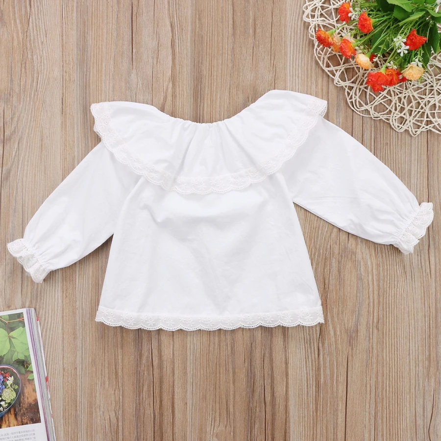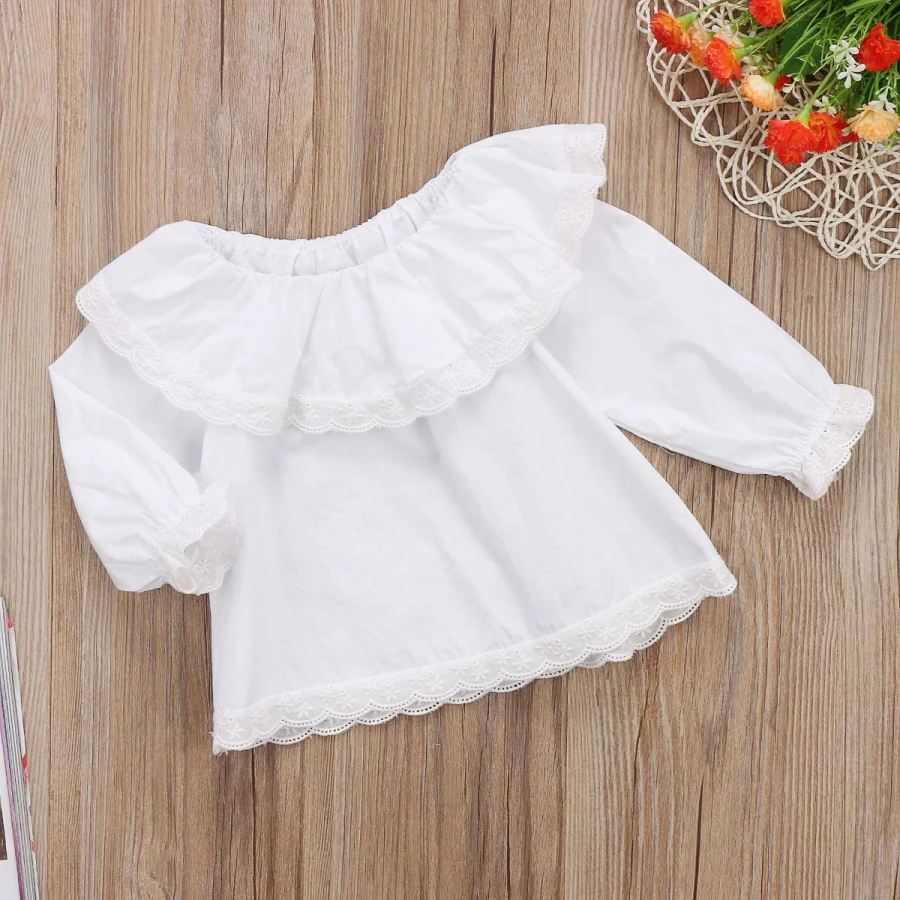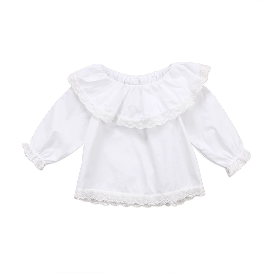 Топы для новорожденных и маленьких девочек, блузки Осенние футболки с длинными рукавами кружевной топ с открытыми плечами, одежда для малышей белый цвет, от 0 до 24 месяцев