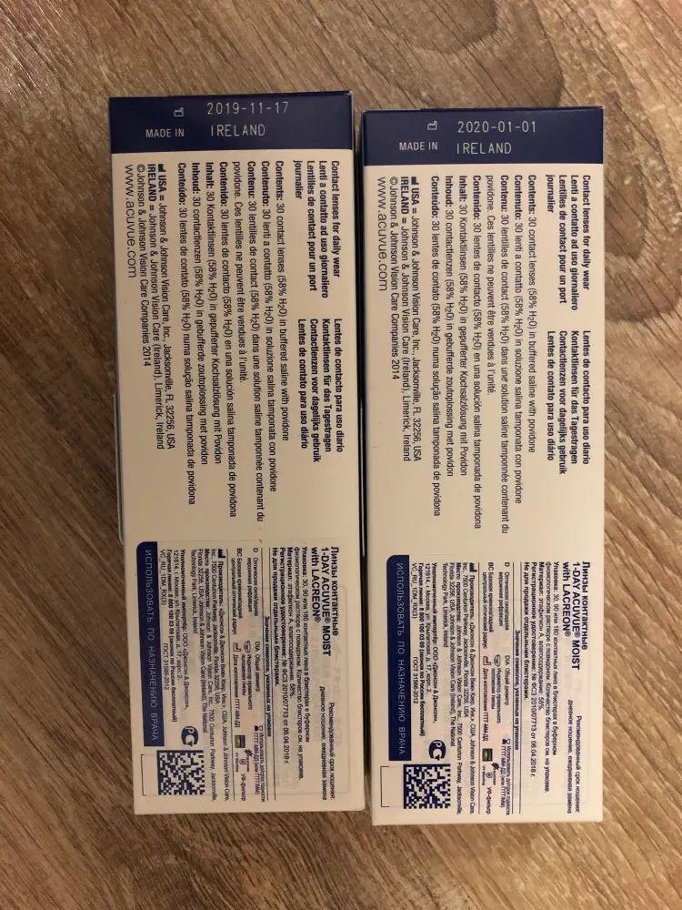 Повезло, оказались оригинальными. Изготовлены в Ирландии. Судя по иероглифам, для какого-то азиатского региона. Не сфотографировал, потому что сразу распаковал проверить, т.к. были сомнения из-за цены. Со скидкой получилось 900₽ - почти в два раза дешевле, чем в линзоматах. Доволен. Буду брать ещё.