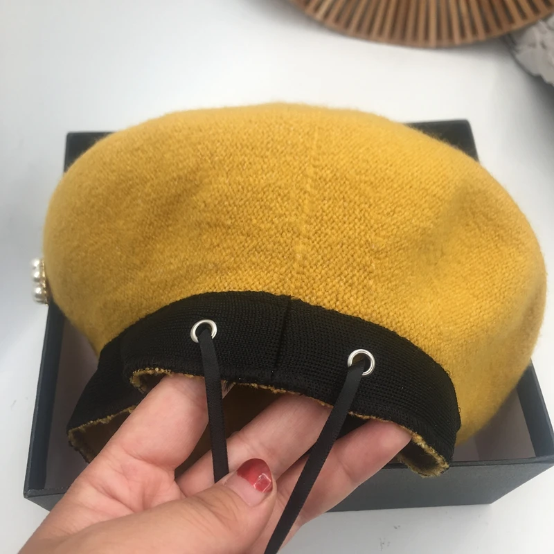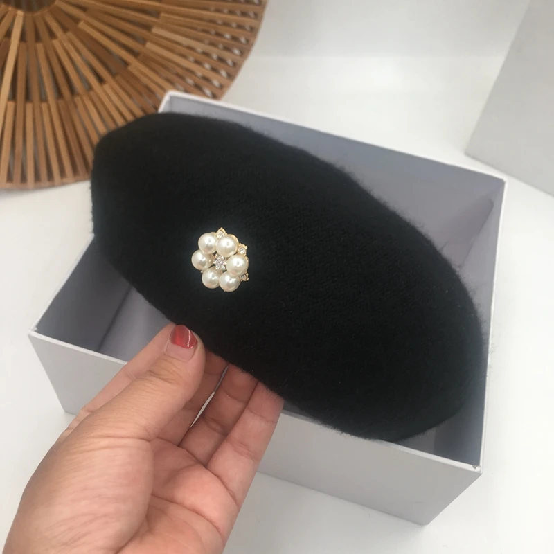 Зимние шапки для женщин, повседневный берет, Роскошные шерстяные шапки с жемчугом, Осенние, регулируемые