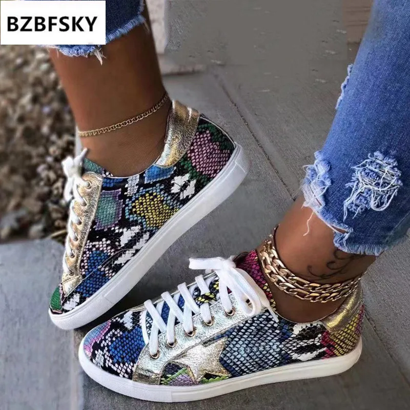 Женские кроссовки со змеиным принтом, ПУ кожа, на шнуровке, Вулканизированная подошва, прогулочная обувь