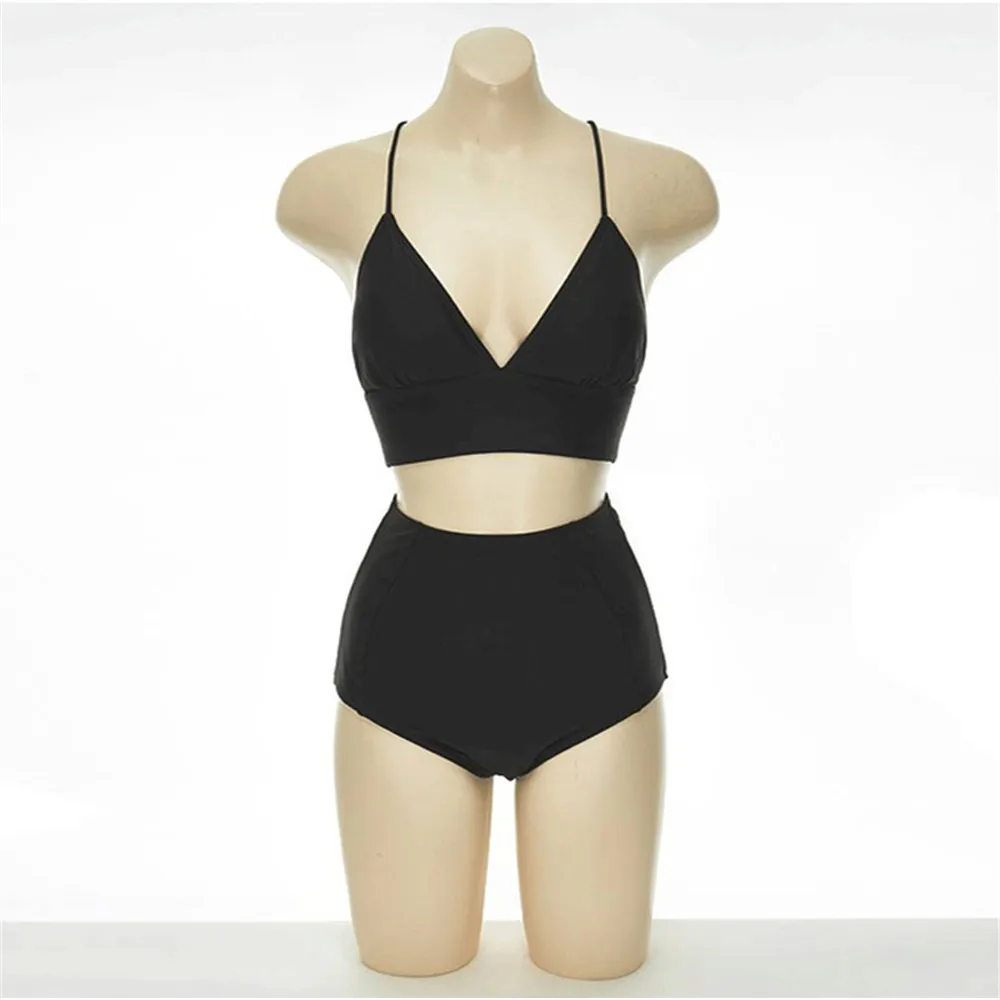 Бикини женское с высокой талией, пикантный однотонный купальник с ч...