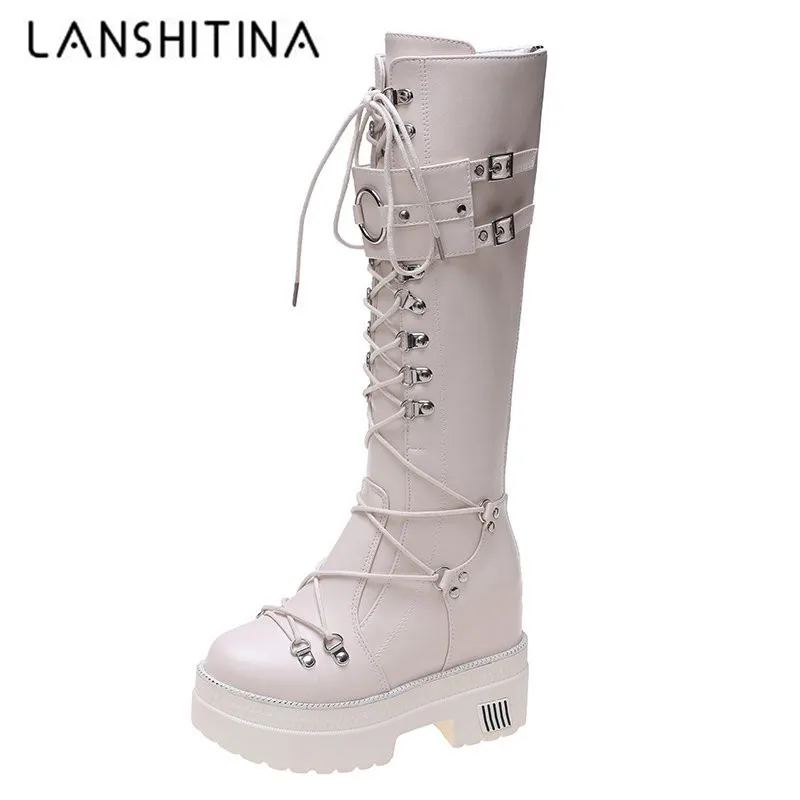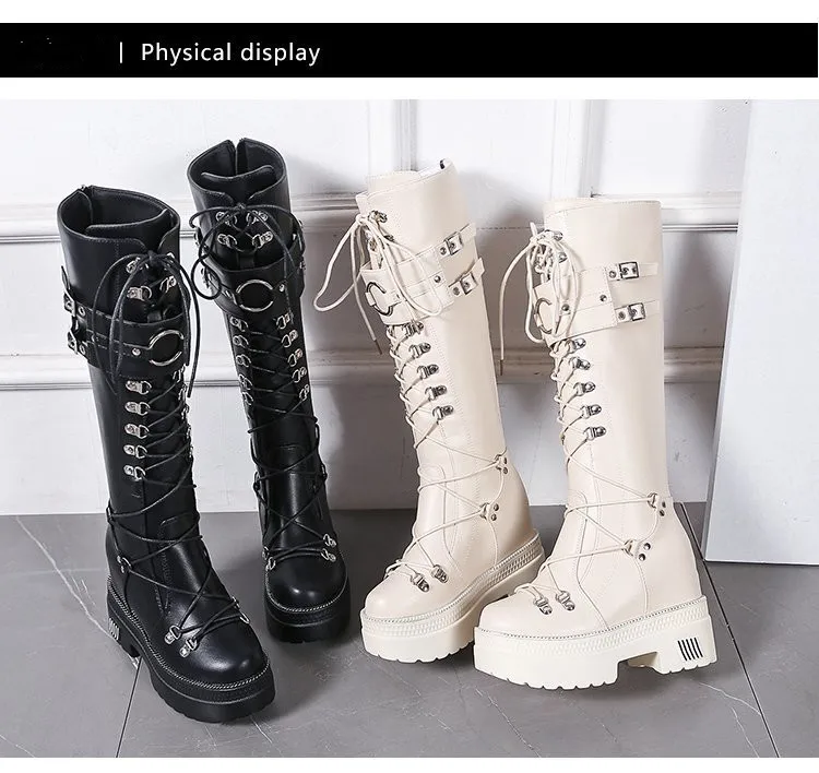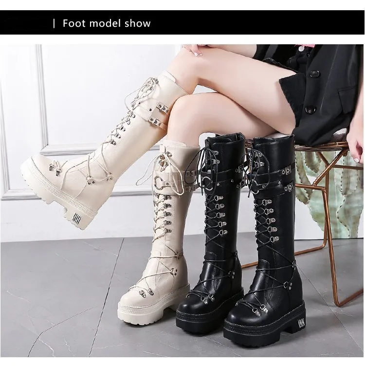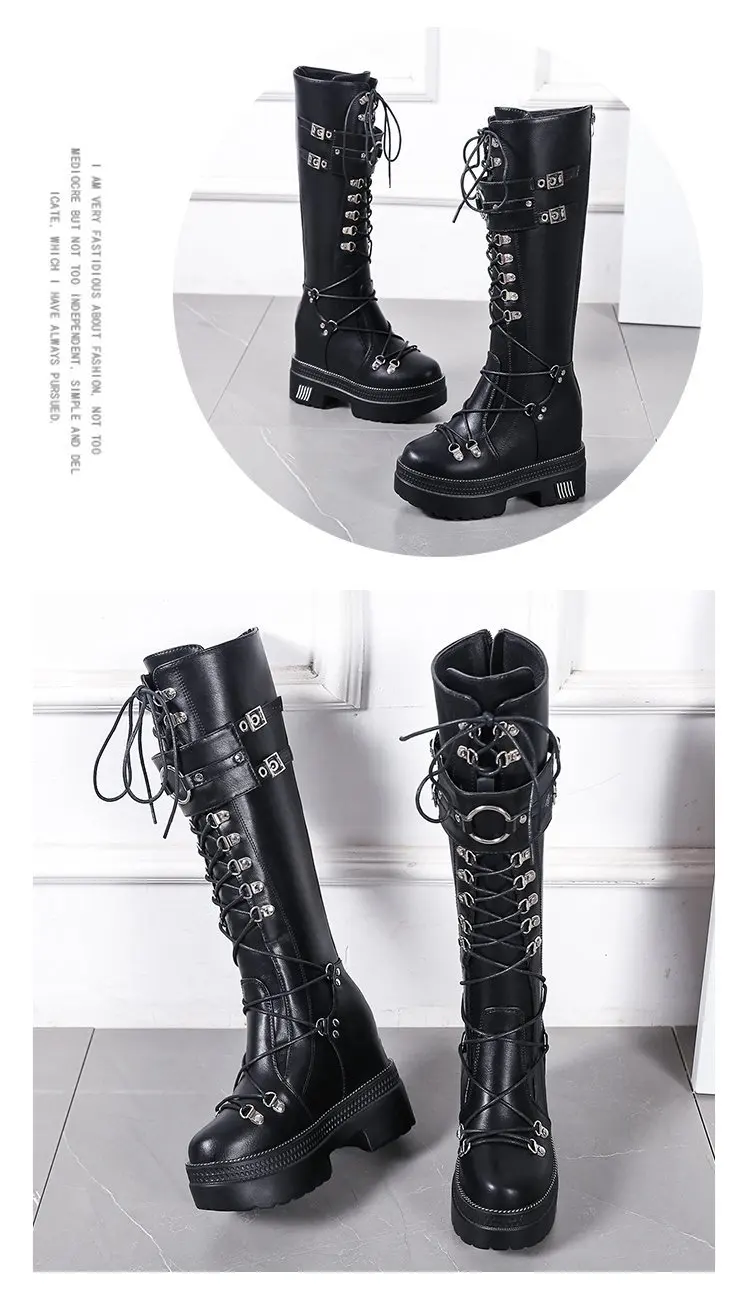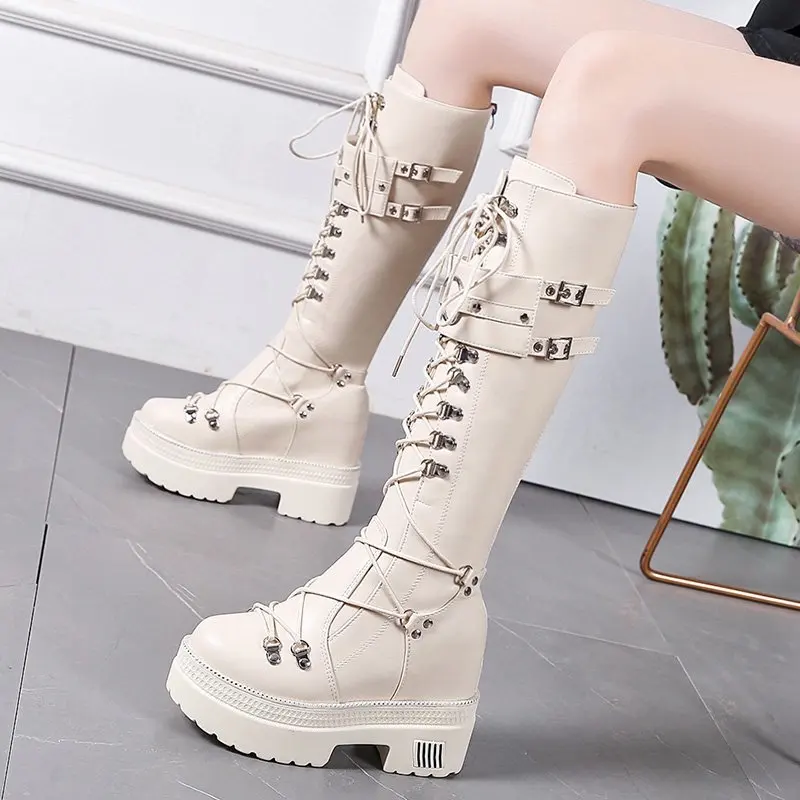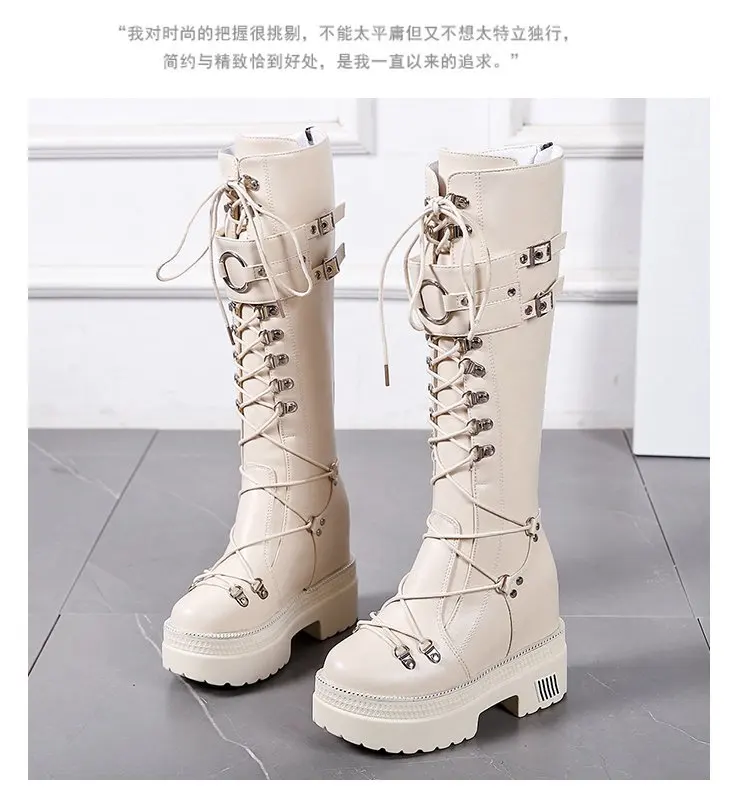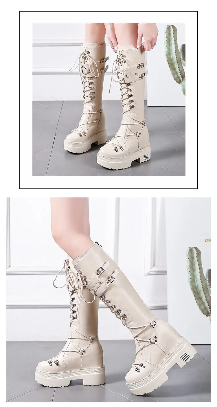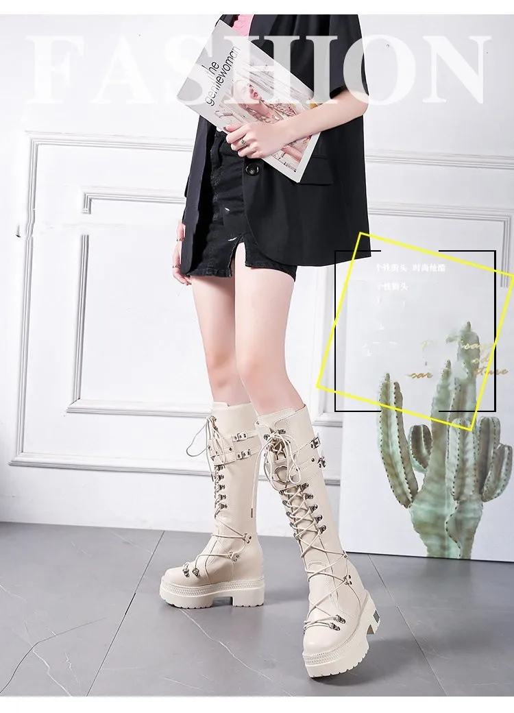 2020 кожаные сапоги до колена на массивной платформе; Женские высокие сапоги в стиле ретро, панк, визуально увеличивающие рост; Женские зимние ботинки на шнуровке; Mujer