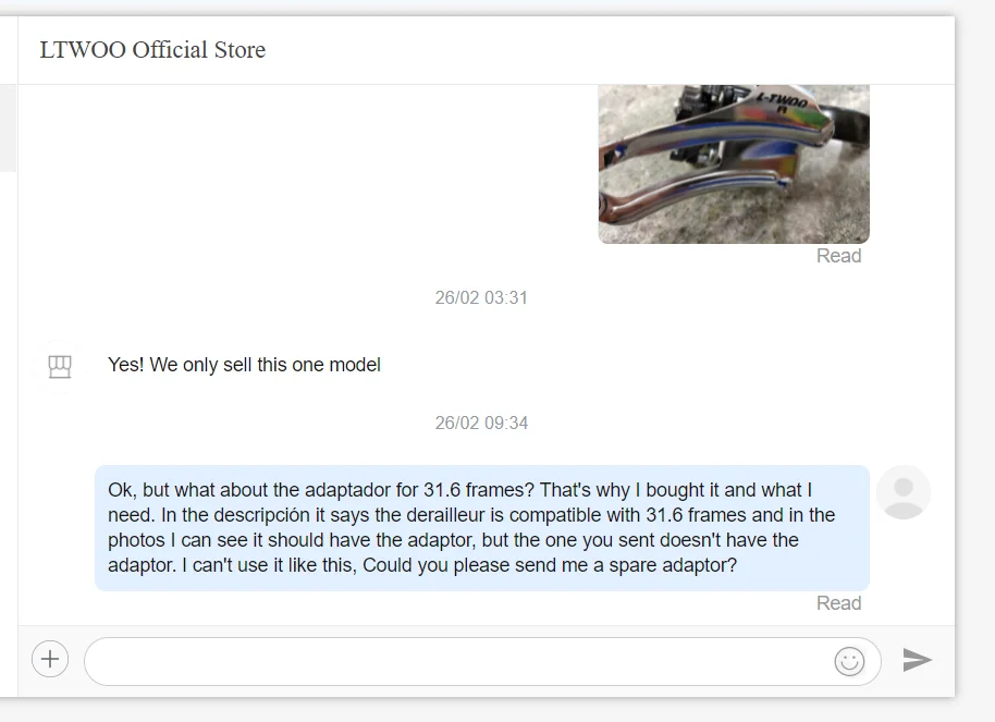 Переключатель не включает адаптер для 31,8 мм, именно поэтому я его купил. В описании указано, что переключатель совместим с диаметром зажима 31,8 или 34,9 мм, и на фотографиях вы можете четко видеть, что он должен включать адаптер, но у меня нет. Я не могу использовать его так себе. Я уведомил продавца и запросил решение. Они прочли мое сообщение, но даже не потрудились ответить.